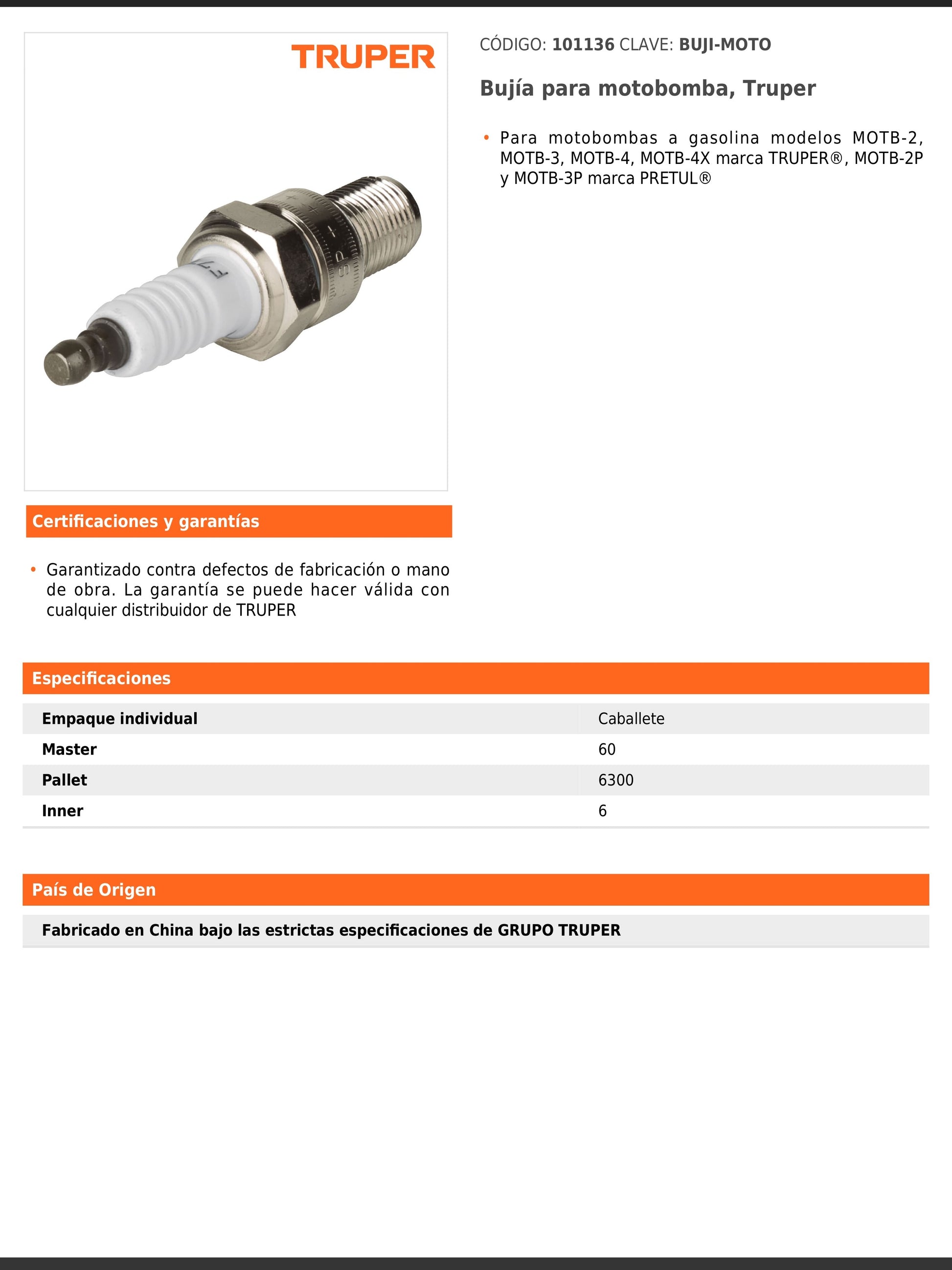 Bujía compatible con motobombas a gasolina modelos MOTB-2, MOTB-3, MOTB-4 y MOTB-4X de la línea Truper, así como MOTB-2P y MOTB-3P de la línea Pretul. Fabricada bajo estrictos estándares para garantizar encendido confiable y durabilidad.