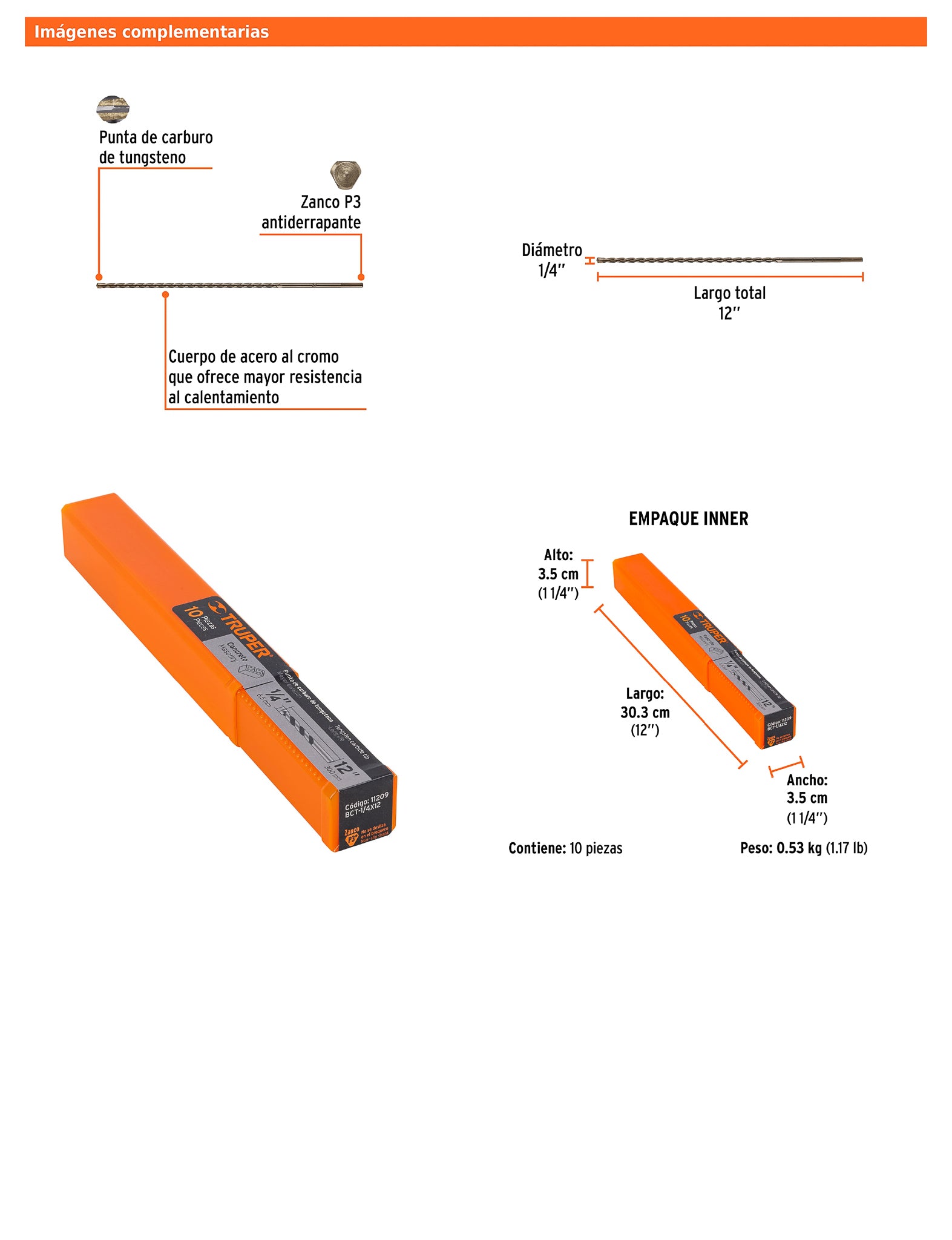 Broca para concreto de 1/4 x 12 pulgadas fabricada con cuerpo de acero al cromo que ofrece gran resistencia al calentamiento y punta de carburo de tungsteno que proporciona perforaciones precisas y duraderas. Equipada con zanco P3 antiderrapante que evita el deslizamiento en el broquero, brinda mayor control y estabilidad.