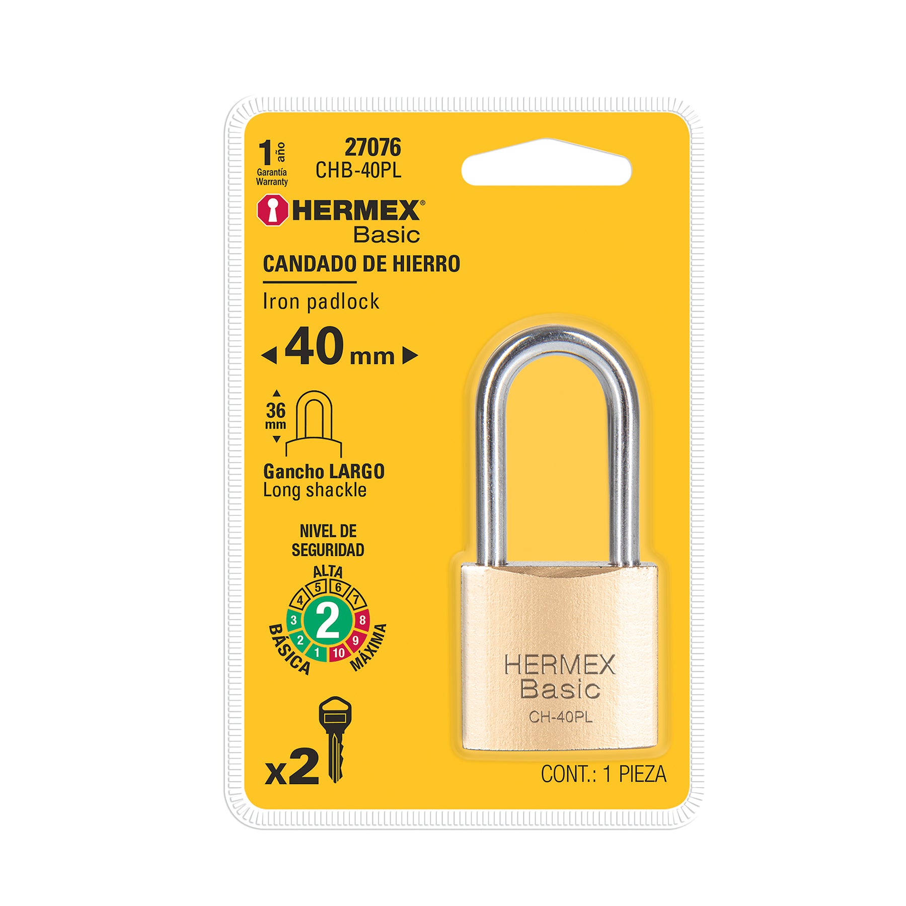 Candado BASIC de 40 mm fabricado en cuerpo de hierro con acabado color latón y gancho largo de acero cromado. Ofrece un nivel de seguridad básico, con cilindro metálico y seguro tipo perno. Su mecanismo interno resistente a la corrosión lo hace ideal para aplicaciones domésticas ligeras o de interior. Incluye dos llaves.