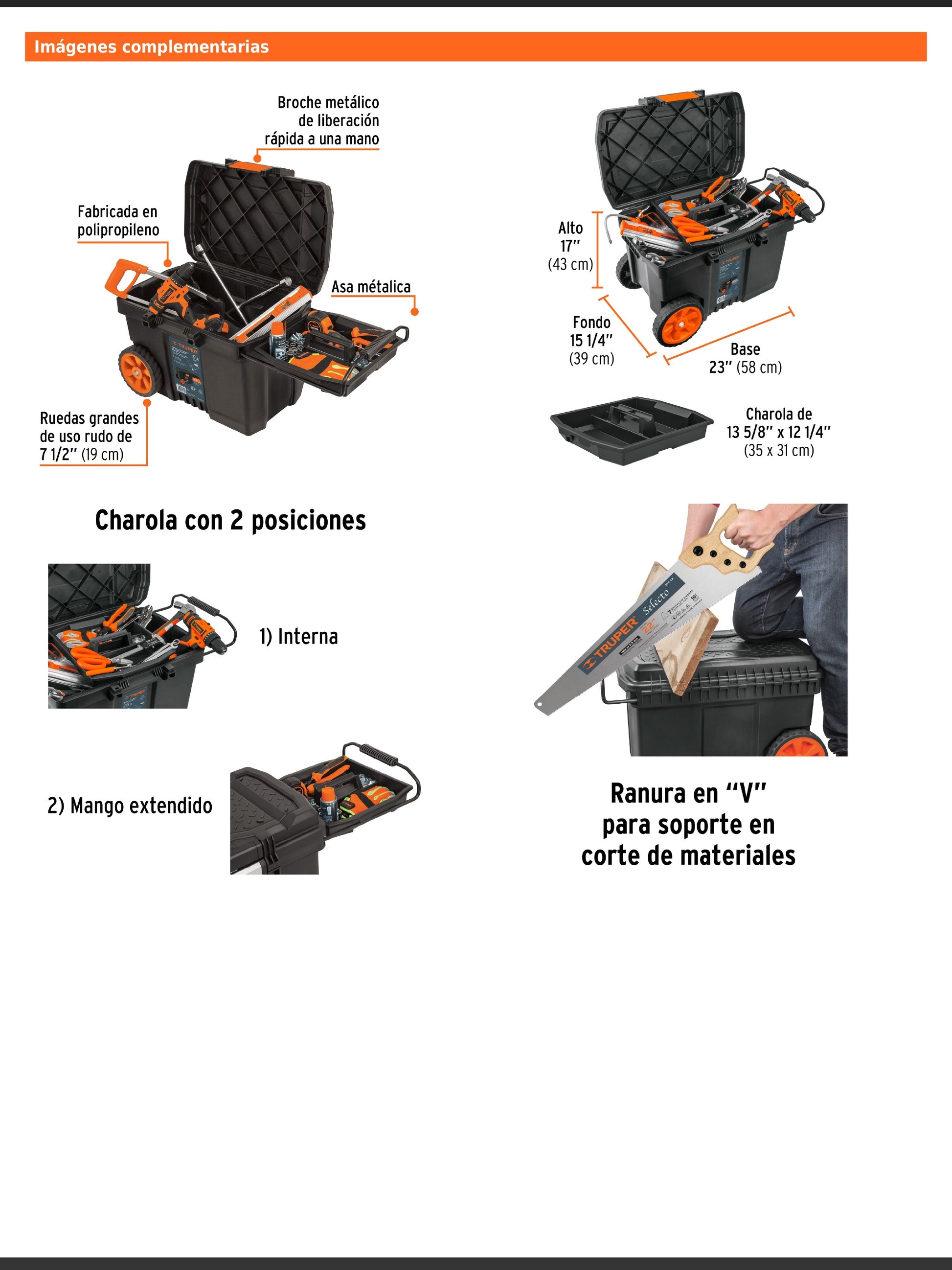 Caja portaherramientas fabricada en polipropileno resistente, equipada con ruedas de uso rudo de 19 cm y mango telescópico para un transporte cómodo. Incorpora broche metálico de liberación rápida, asa metálica y ranura en "V" en la tapa que funciona como soporte para cortes de materiales. Incluye charola organizadora interna. Se presenta en empaque individual tipo etiqueta.