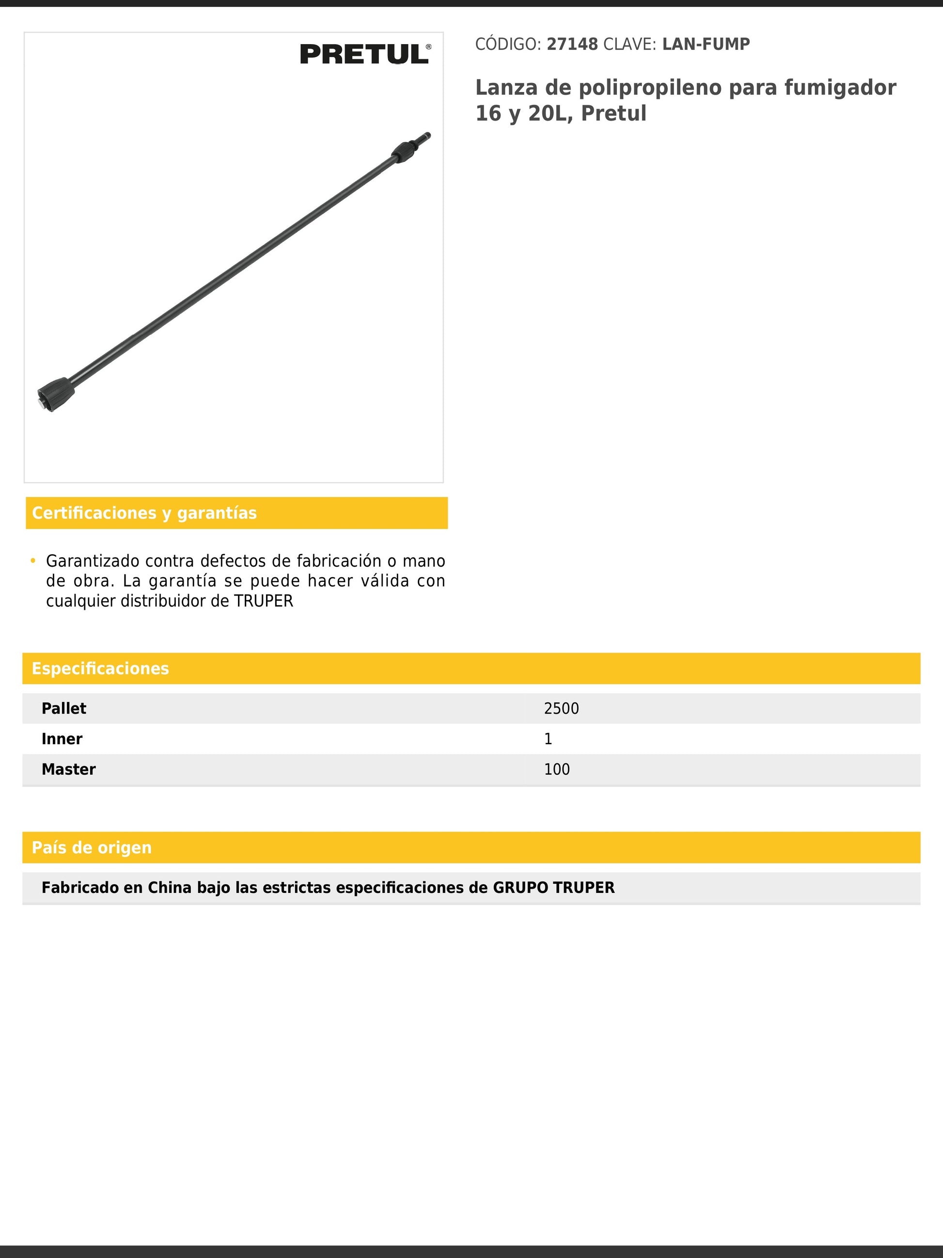 Lanza de repuesto fabricada en polipropileno, compatible con fumigadores Pretul de 16 y 20 L. Diseñada para garantizar un uso duradero y confiable en aplicaciones agrícolas y de jardinería.