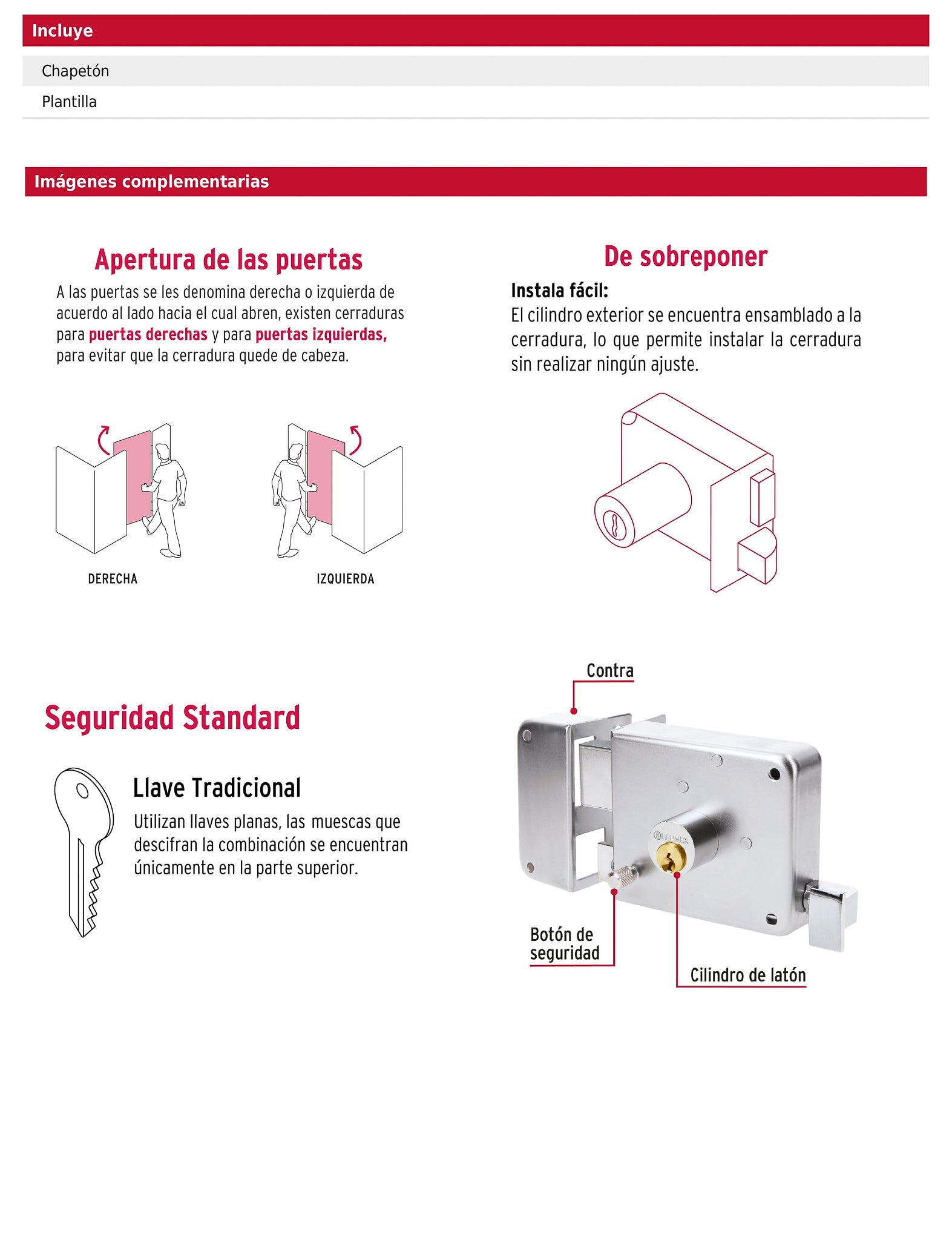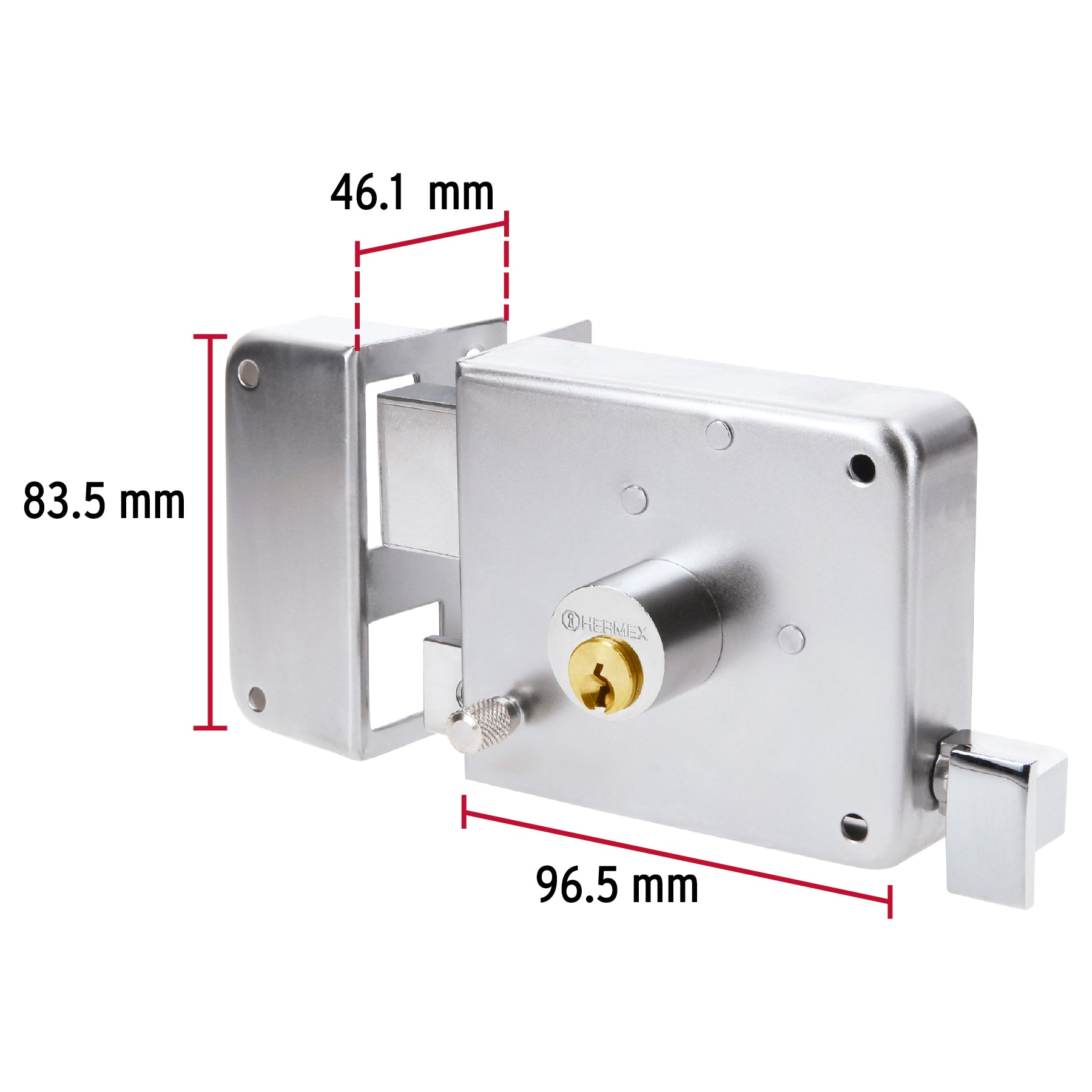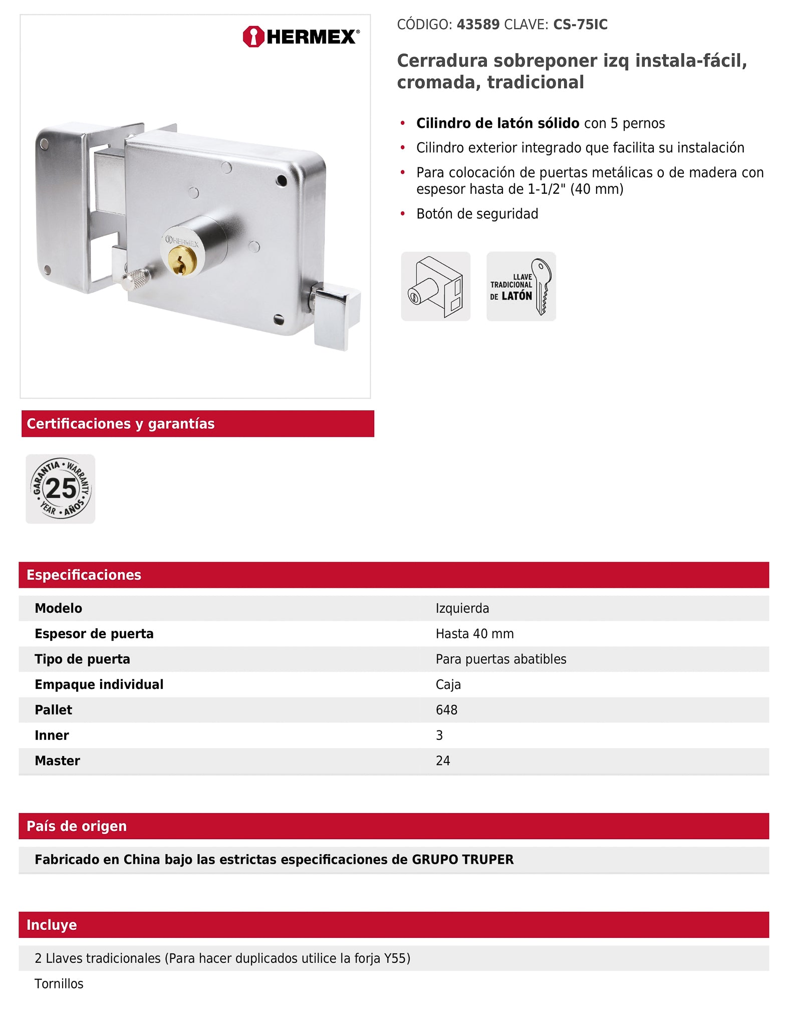 Cerradura de sobreponer con cilindro de latón sólido de 5 pernos y cilindro exterior integrado que facilita su instalación. Presenta acabado cromado y botón de seguridad, ideal para puertas metálicas o de madera con espesor de hasta 40 mm.