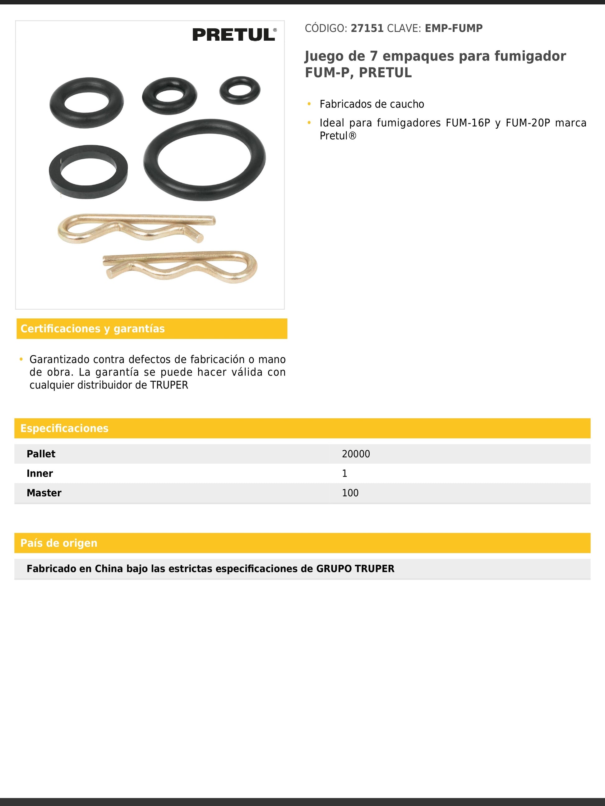 Juego de empaques fabricados en caucho, diseñados como repuesto para fumigadores Pretul modelos FUM-16P y FUM-20P.
