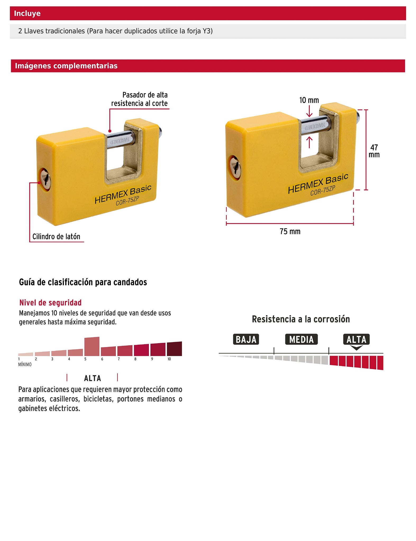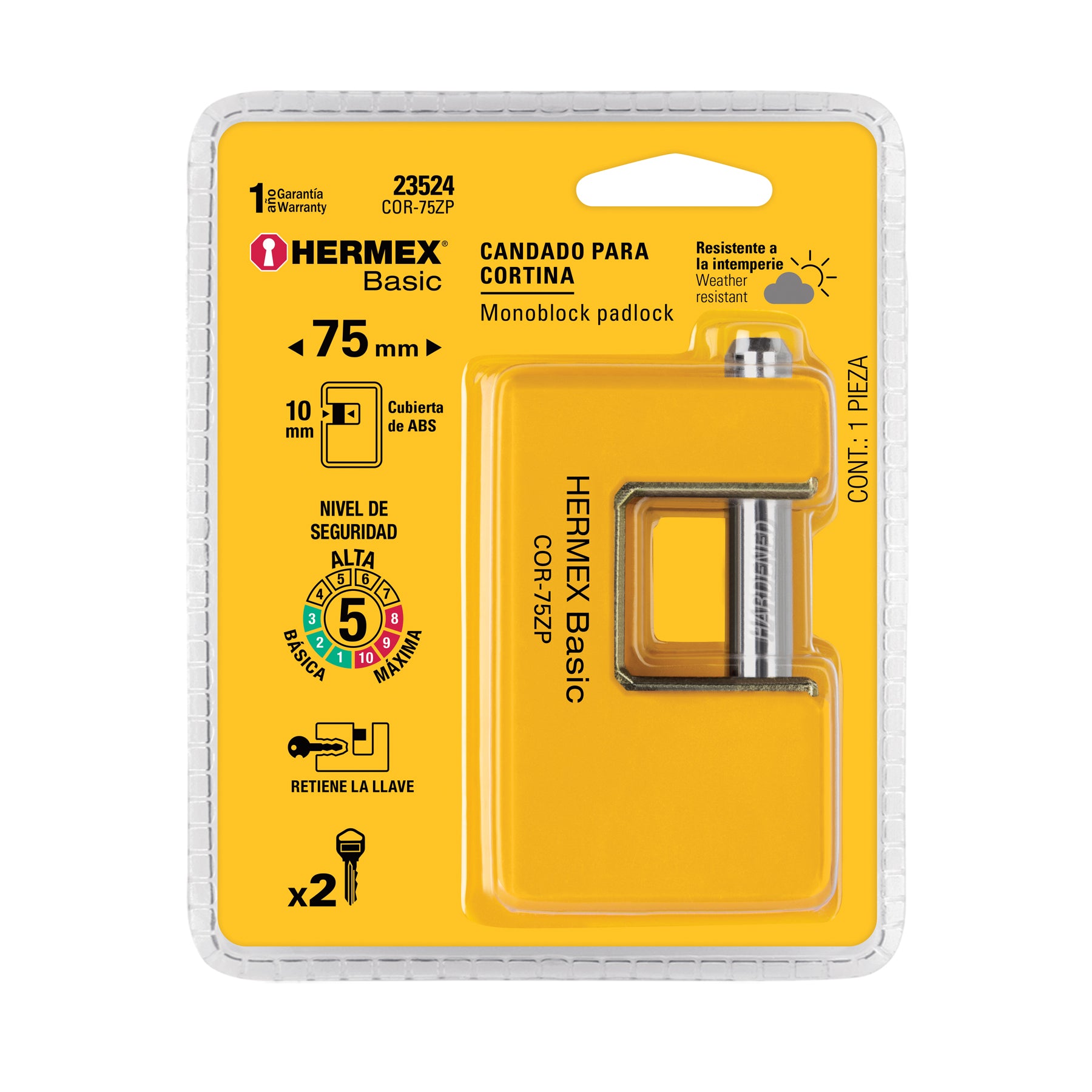 Candado HERMEX BASIC de 75 mm con cuerpo metálico recubierto de ABS, diseñado para ofrecer alta protección contra palanca y golpes. Cuenta con cilindro de latón con 4 pines, seguro tipo perno y componentes internos resistentes a la corrosión. Ideal para cortinas metálicas y aplicaciones de seguridad de alto nivel.