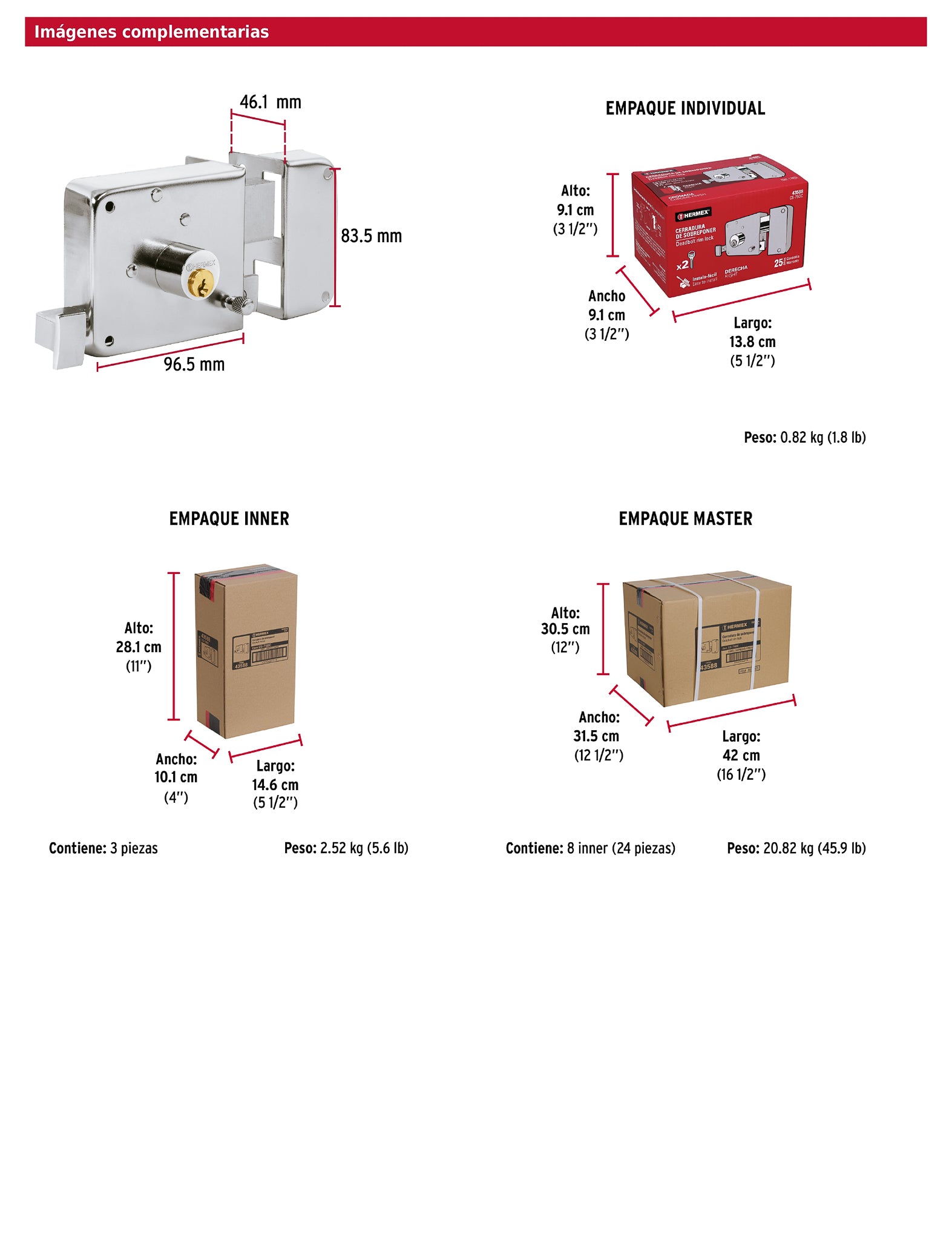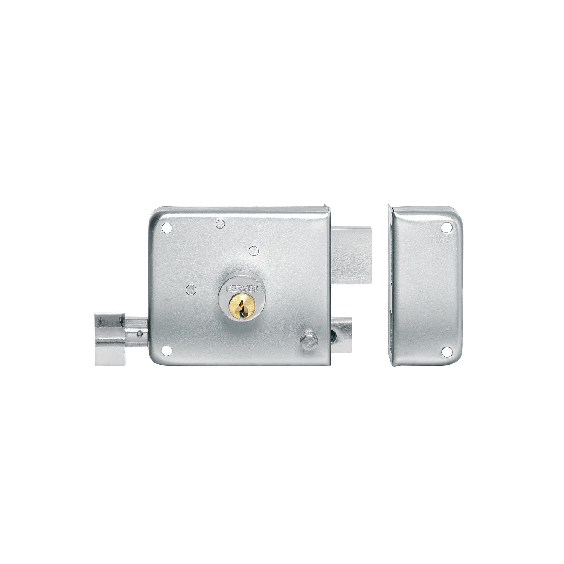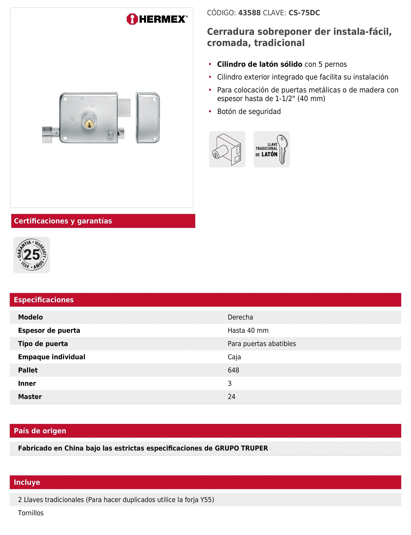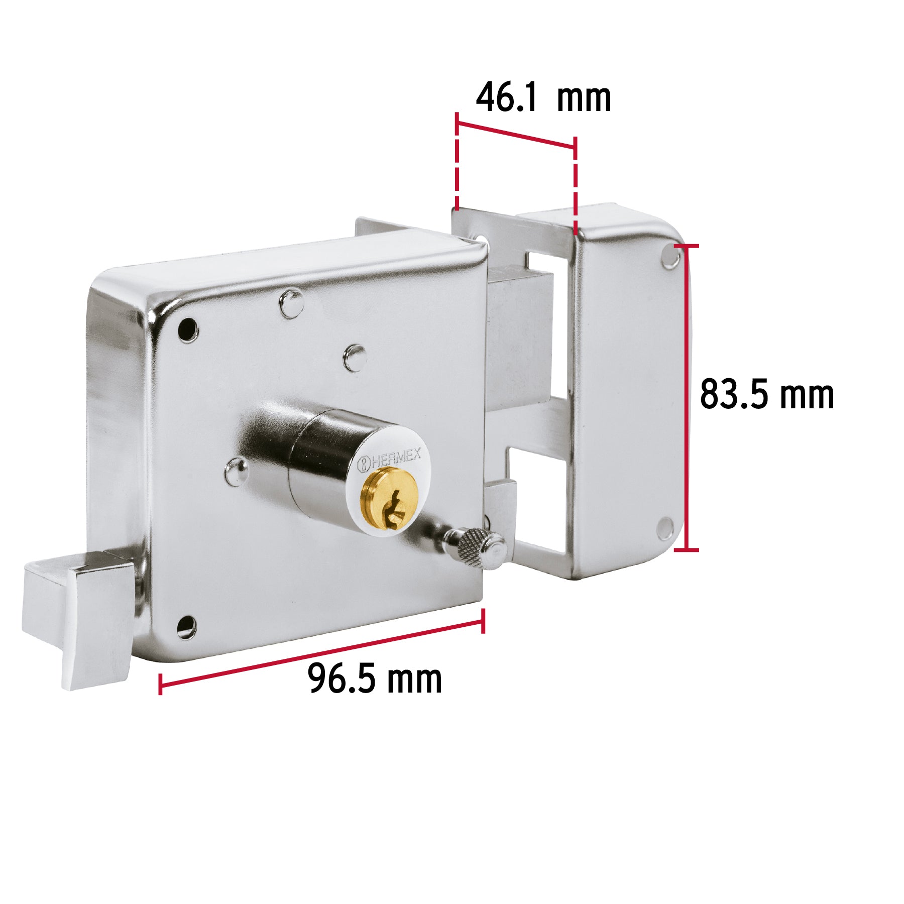 Cerradura de sobreponer con cilindro de latón sólido de 5 pernos y cilindro exterior integrado que facilita su instalación. Cuenta con acabado cromado y botón de seguridad, ideal para puertas metálicas o de madera con espesor de hasta 40 mm.