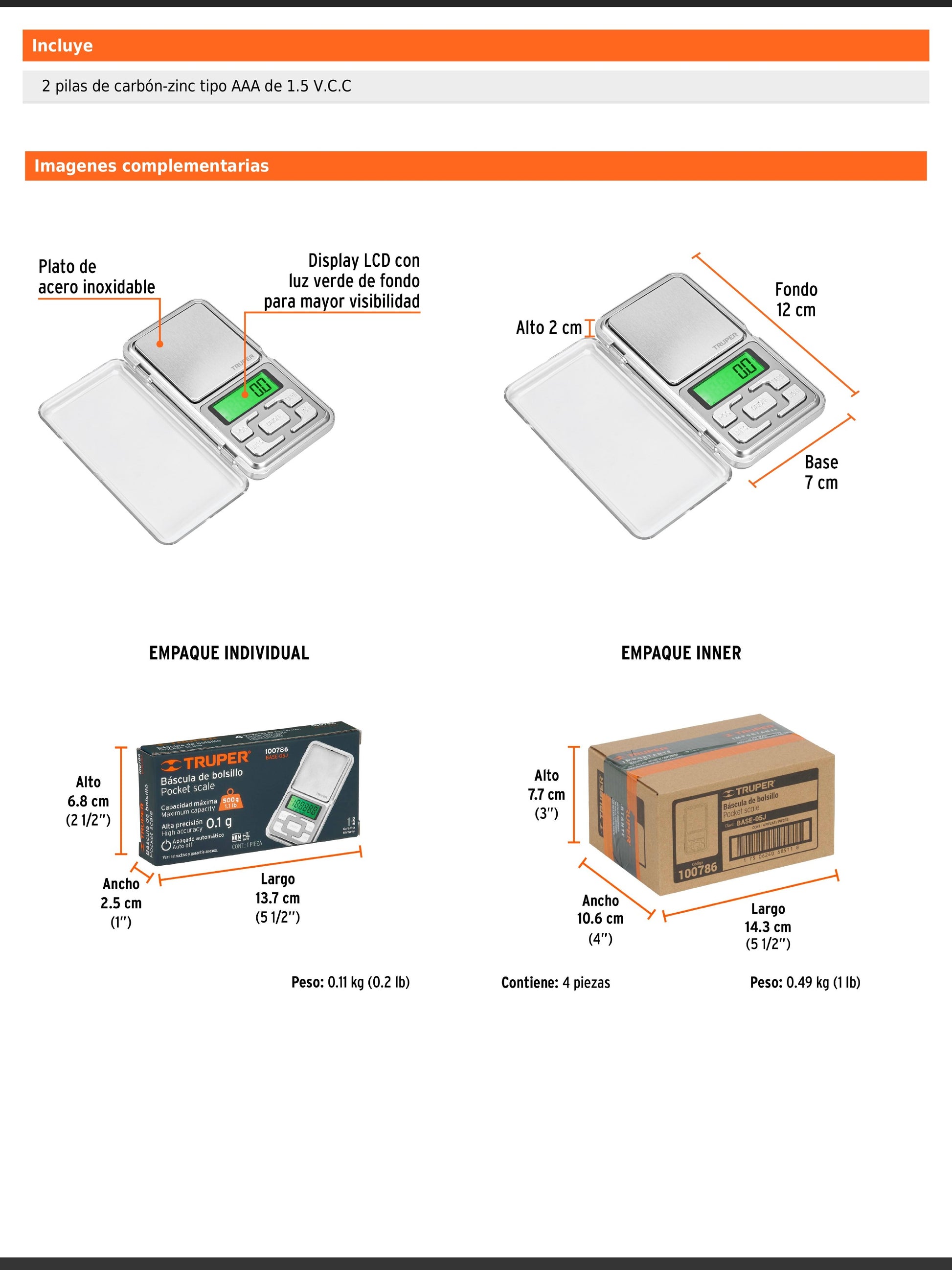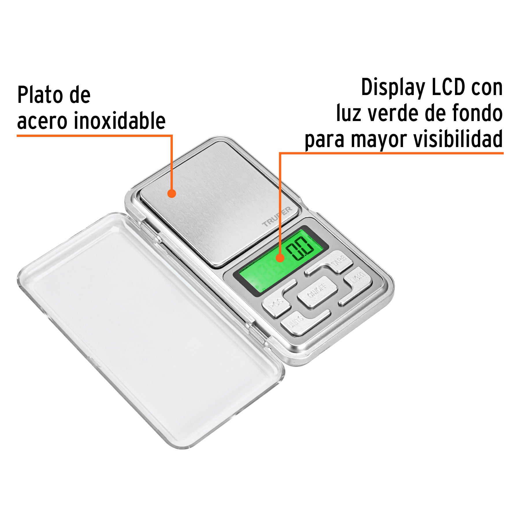 Báscula electrónica de bolsillo de 500 g con cuerpo de ABS y cubierta de poliestireno. Incluye plato de acero inoxidable de 5x5 cm, display LCD verde, función TARA, conteo de piezas, apagado automático, diseño compacto y portátil. Usa 2 pilas AAA incluidas y cumple con la norma NOM-010-SCFI.