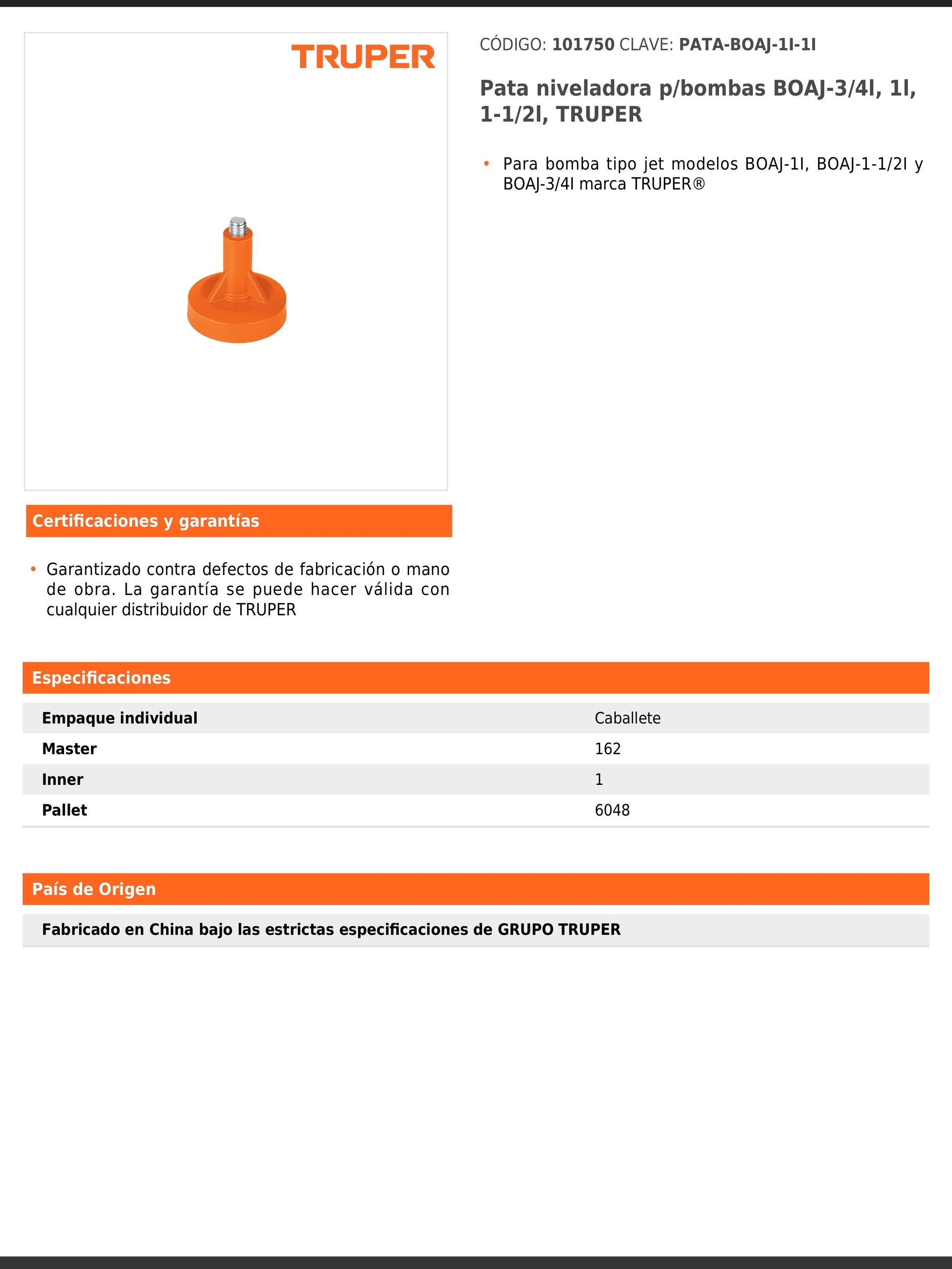 Pata niveladora diseñada para bombas tipo jet modelos BOAJ-1I, BOAJ-1-1/2I y BOAJ-3/4I. Fabricada bajo estrictos estándares de calidad, garantiza estabilidad y soporte confiable durante la operación de las bombas. Su presentación en caballete facilita almacenamiento y distribución.