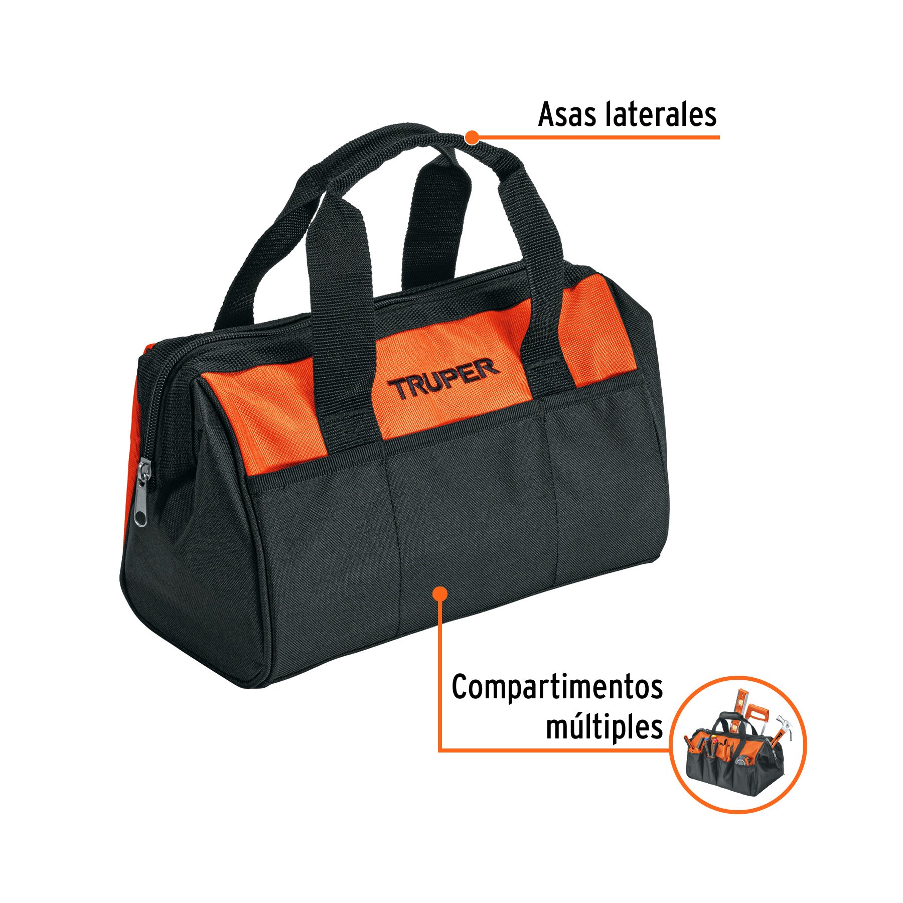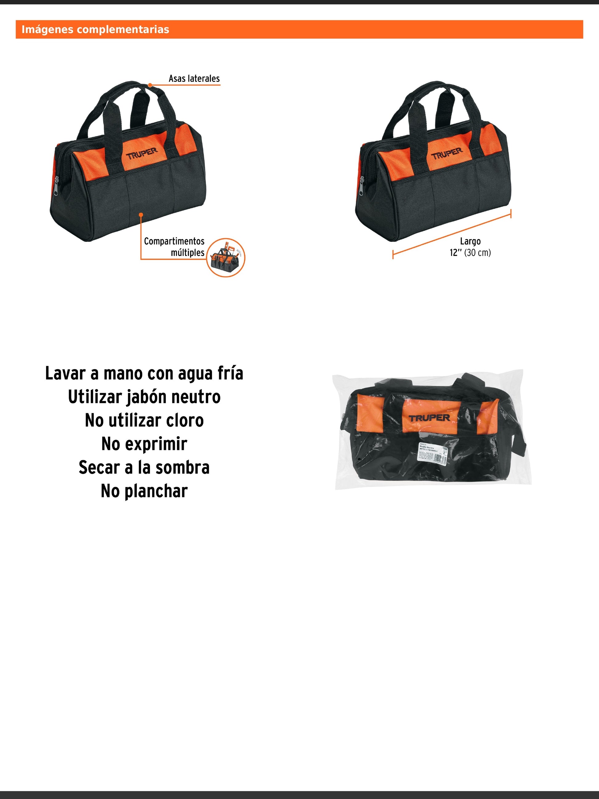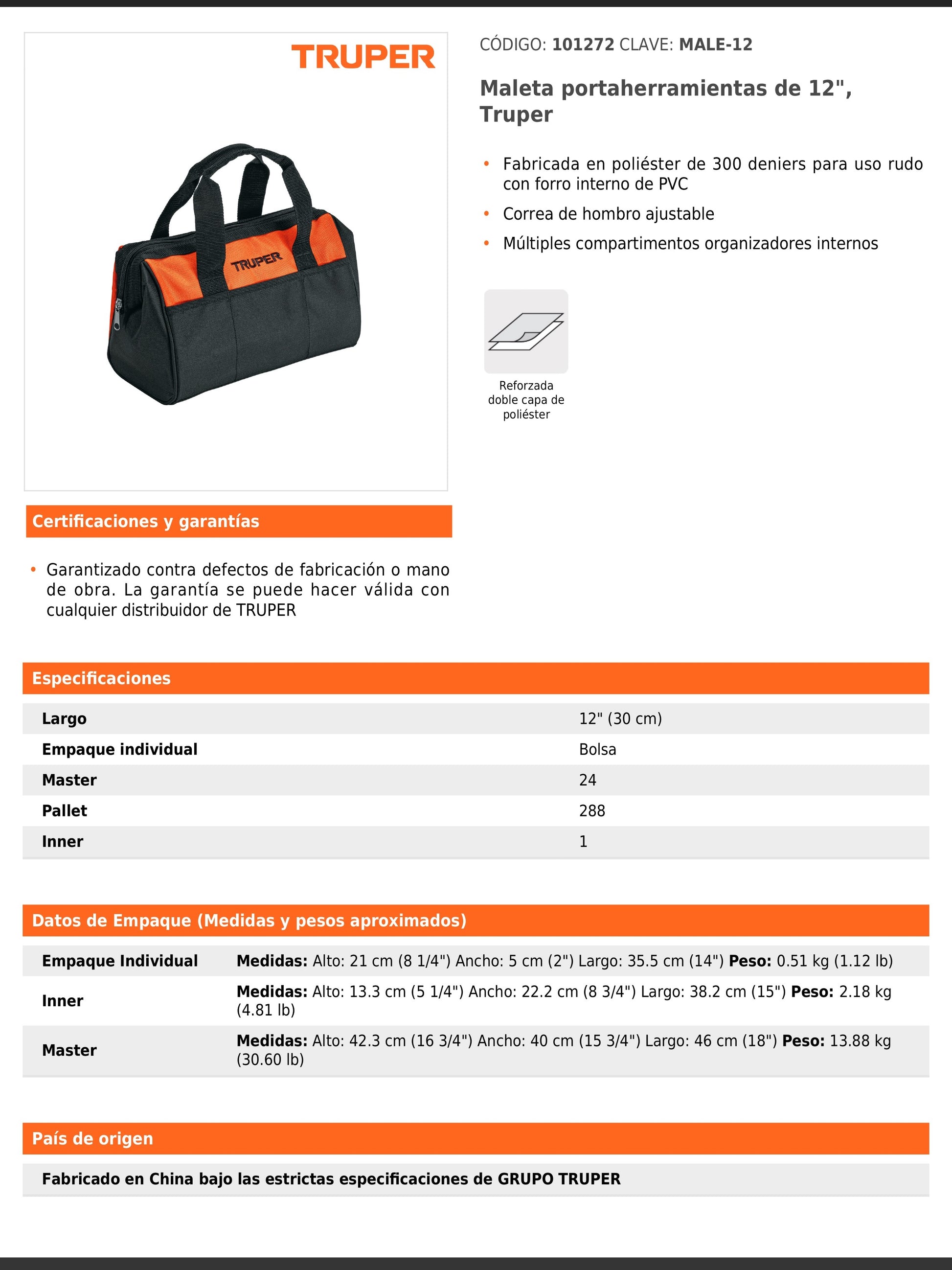 Maleta portaherramientas fabricada en poliéster de 300 deniers de doble capa para uso rudo, con forro interno de PVC que brinda mayor resistencia. Cuenta con correa de hombro ajustable y múltiples compartimentos organizadores internos para mejor distribución de herramientas. Se presenta en empaque individual tipo bolsa.