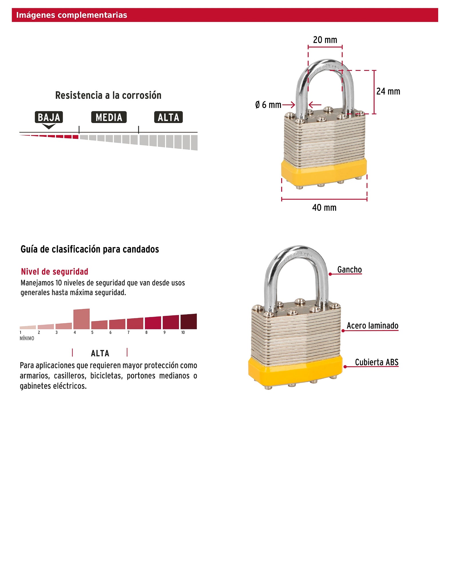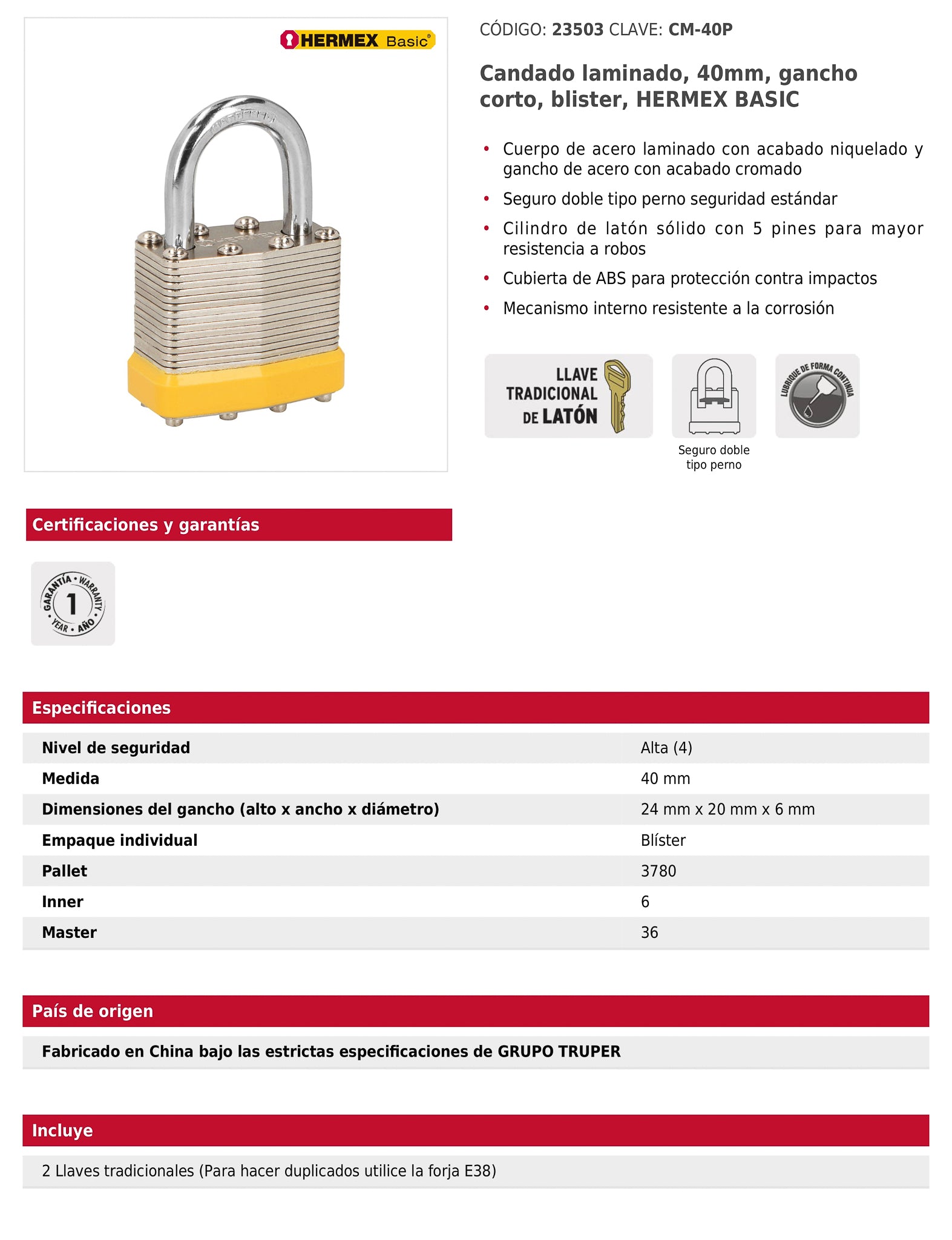 Candado HERMEX BASIC de 40 mm con cuerpo de acero laminado y gancho cromado. Dispone de cilindro de latón sólido con 5 pines, seguro doble tipo perno y mecanismo interno resistente a la corrosión. Su cubierta de ABS brinda protección contra impactos, ideal para usos residenciales, escolares o comerciales ligeros.