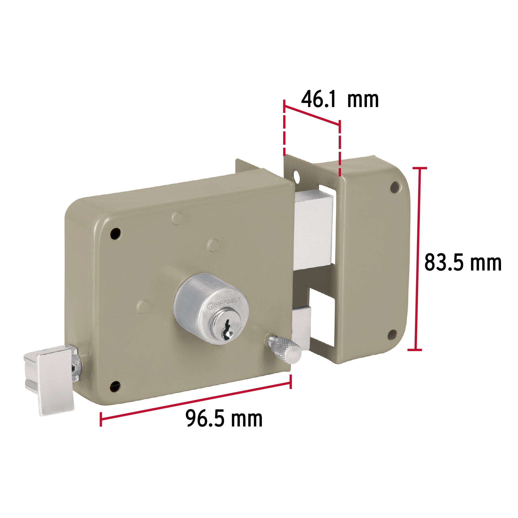 Cerradura de sobreponer con cilindro metálico de 4 pernos y cilindro exterior integrado que facilita su instalación. Diseñada para puertas metálicas o de madera con espesor de hasta 38 mm, incorpora botón de seguridad para mayor protección.