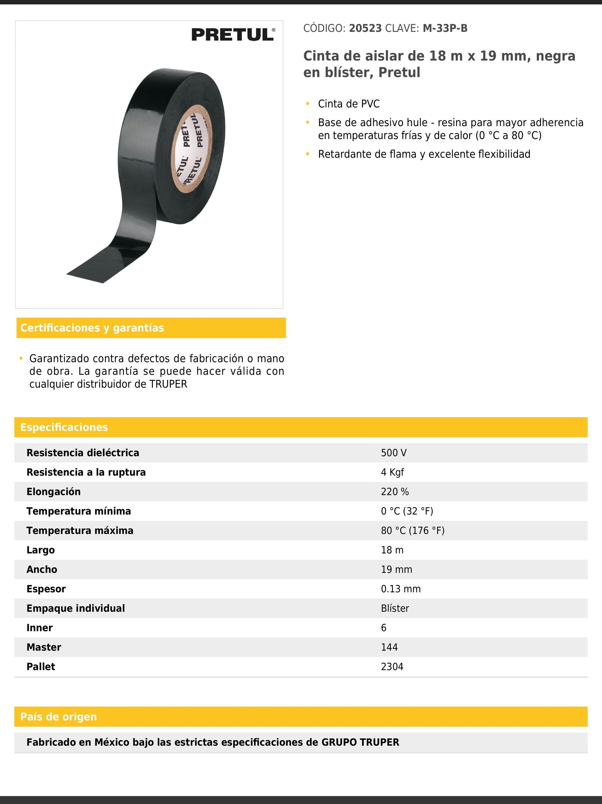 Cinta aislante de PVC con adhesivo hule-resina que ofrece excelente adherencia en temperaturas de 0 °C a 80 °C. Es retardante de flama, flexible y diseñada para trabajos eléctricos que requieren seguridad y resistencia. Se presenta en empaque individual tipo blíster.