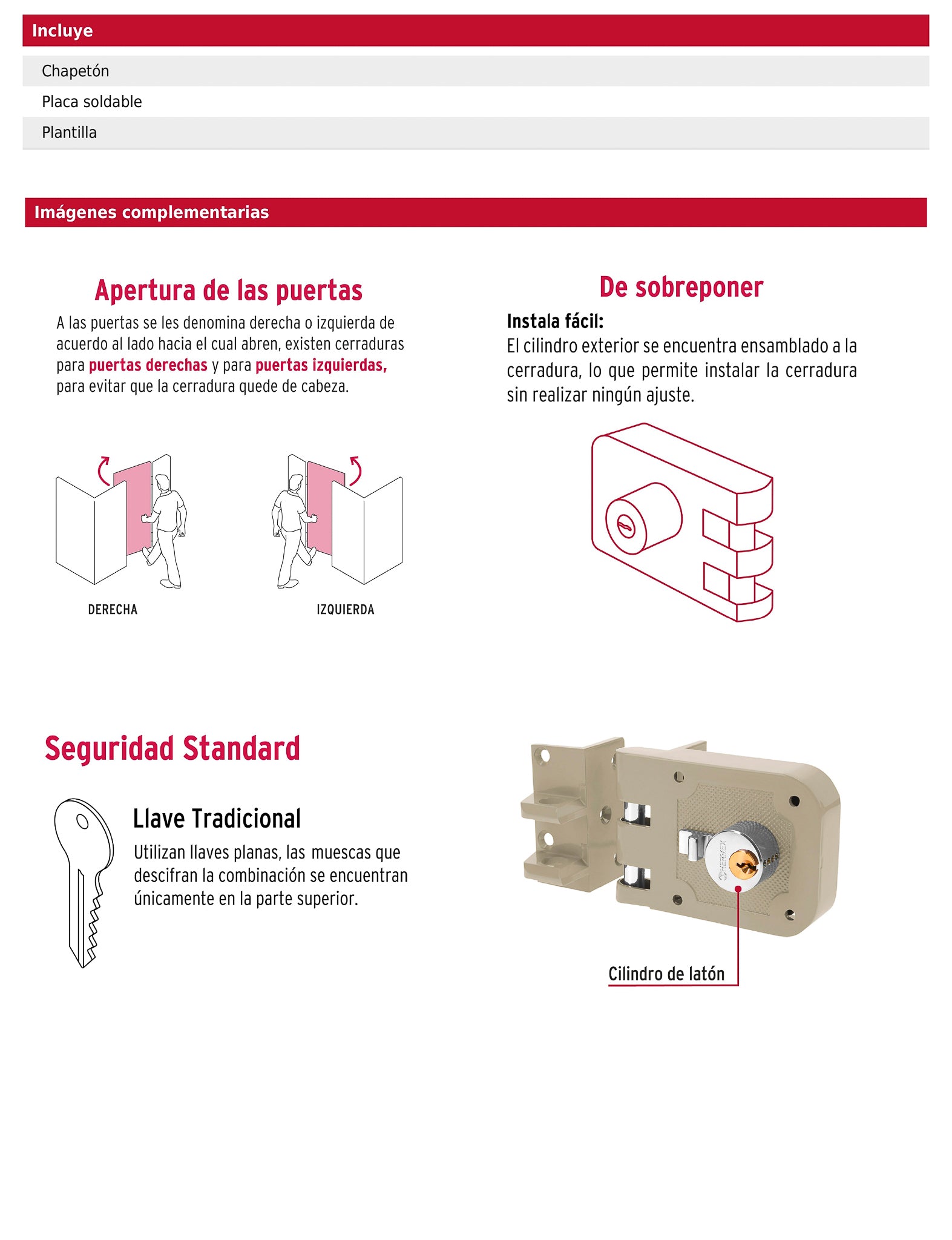 Cerradura de sobreponer con cilindro de latón sólido de 5 pernos y cilindro exterior integrado que facilita su instalación. Incorpora cerrojo tipo mordaza y placa metálica soldable, ideal para puertas metálicas o de madera con espesor de hasta 38 mm.