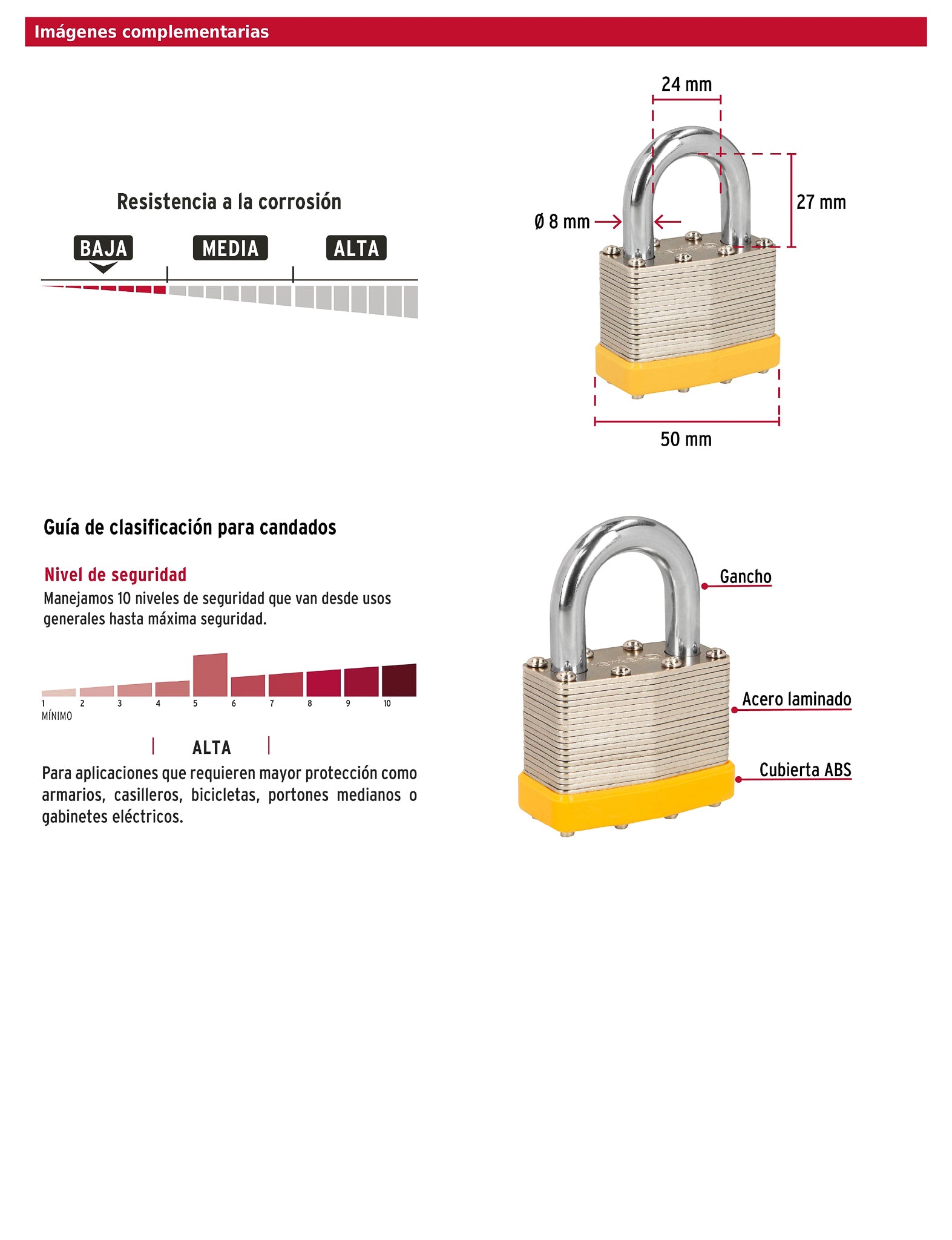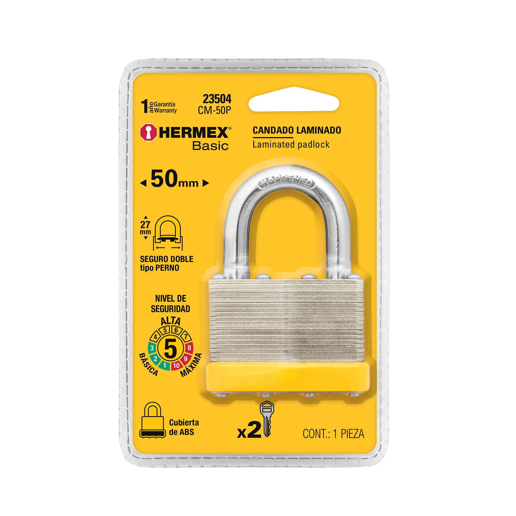 Candado HERMEX BASIC de 50 mm con cuerpo de acero laminado y gancho corto de acero cromado. Dispone de cilindro de latón sólido con 5 pines, seguro doble tipo perno y cubierta de ABS que brinda protección contra impactos. Su mecanismo interno resistente a la corrosión garantiza durabilidad y desempeño confiable en uso residencial o comercial.