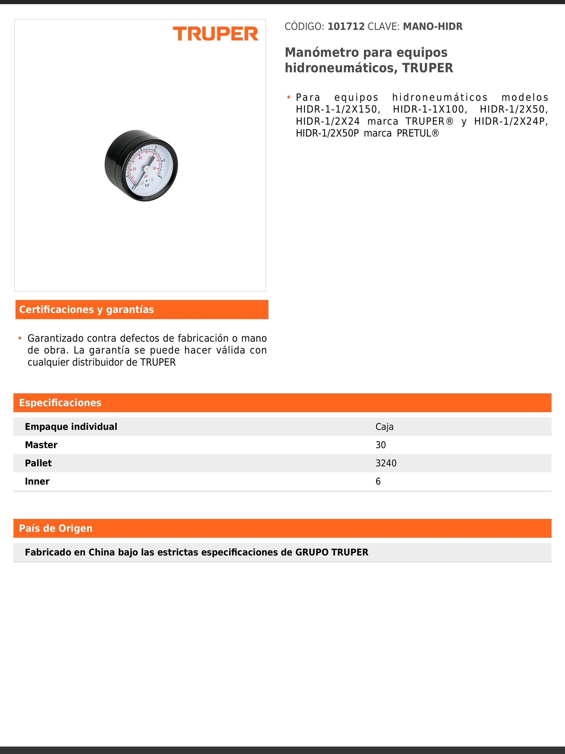 Manómetro diseñado para equipos hidroneumáticos modelos HIDR-1-1/2X150, HIDR-1-1X100, HIDR-1/2X50, HIDR-1/2X24 de la marca Truper y modelos HIDR-1/2X24P e HIDR-1/2X50P de la marca Pretul. Fabricado bajo estrictas especificaciones, garantiza precisión y confiabilidad en la medición de presión, siendo indispensable para el mantenimiento de sistemas hidroneumáticos.