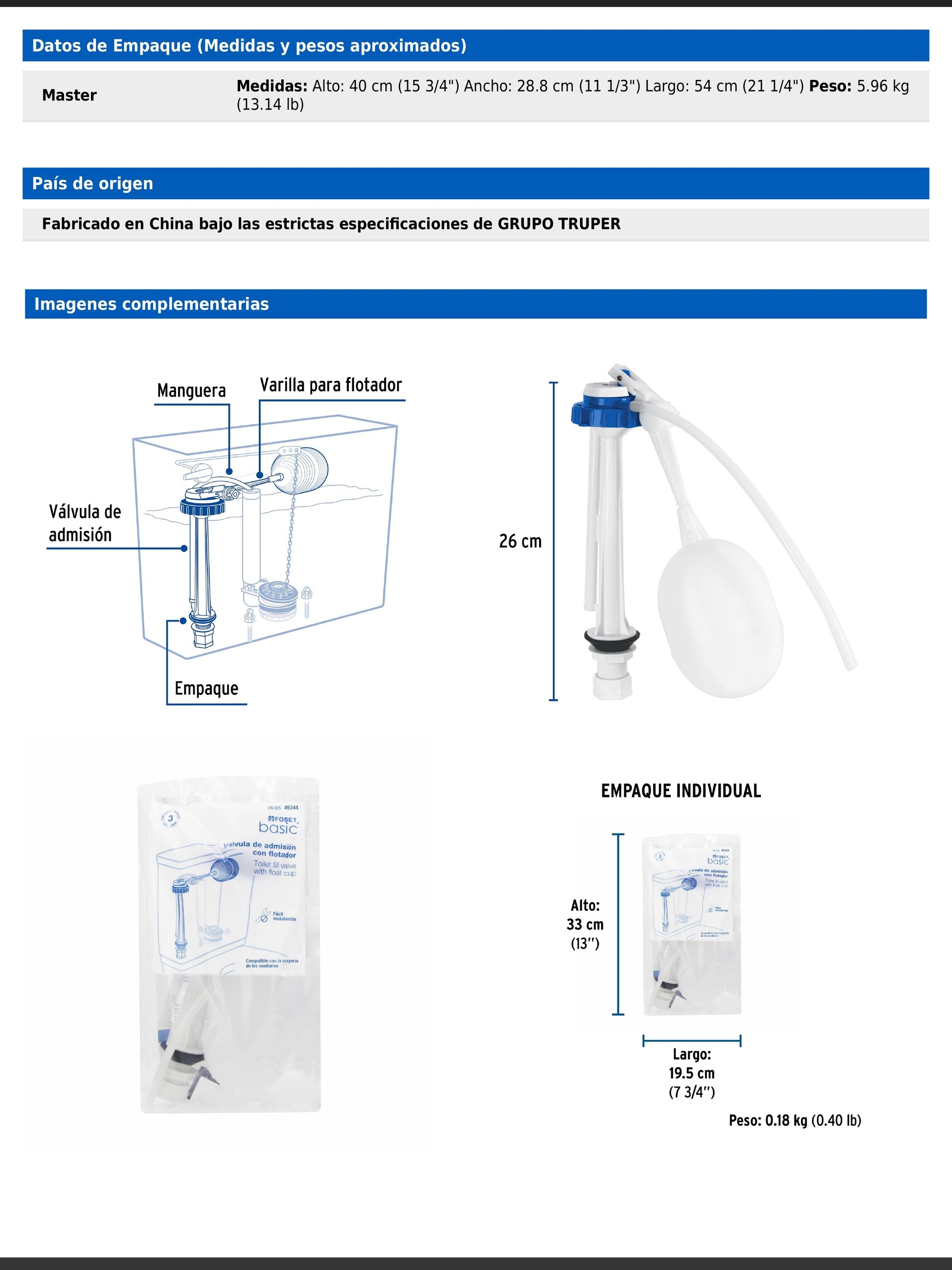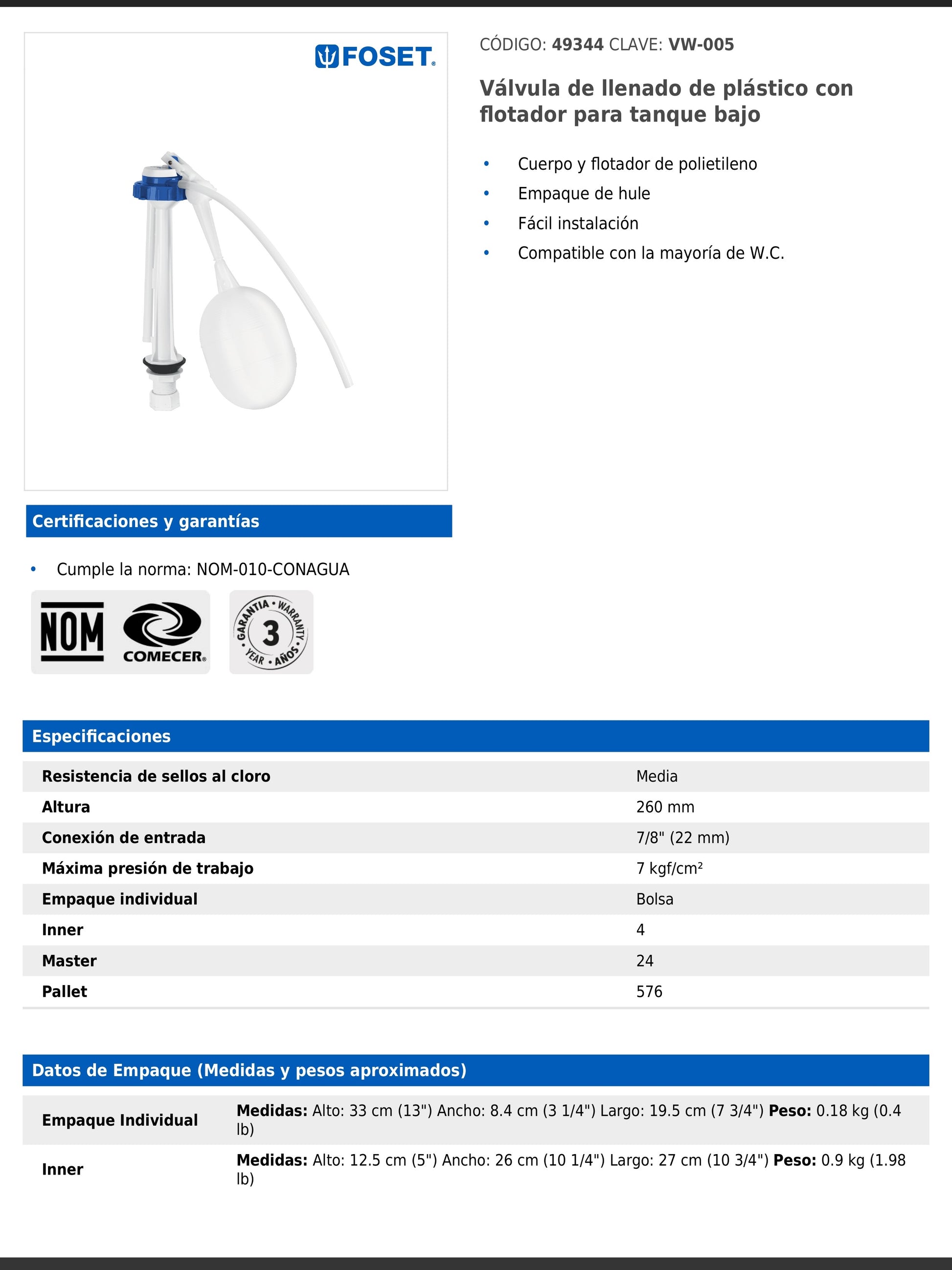 Fabricada con cuerpo y flotador de polietileno, incluye empaque de hule para un sellado confiable. Es de fácil instalación, compatible con la mayoría de inodoros y cumple la norma NOM-010-CONAGUA.