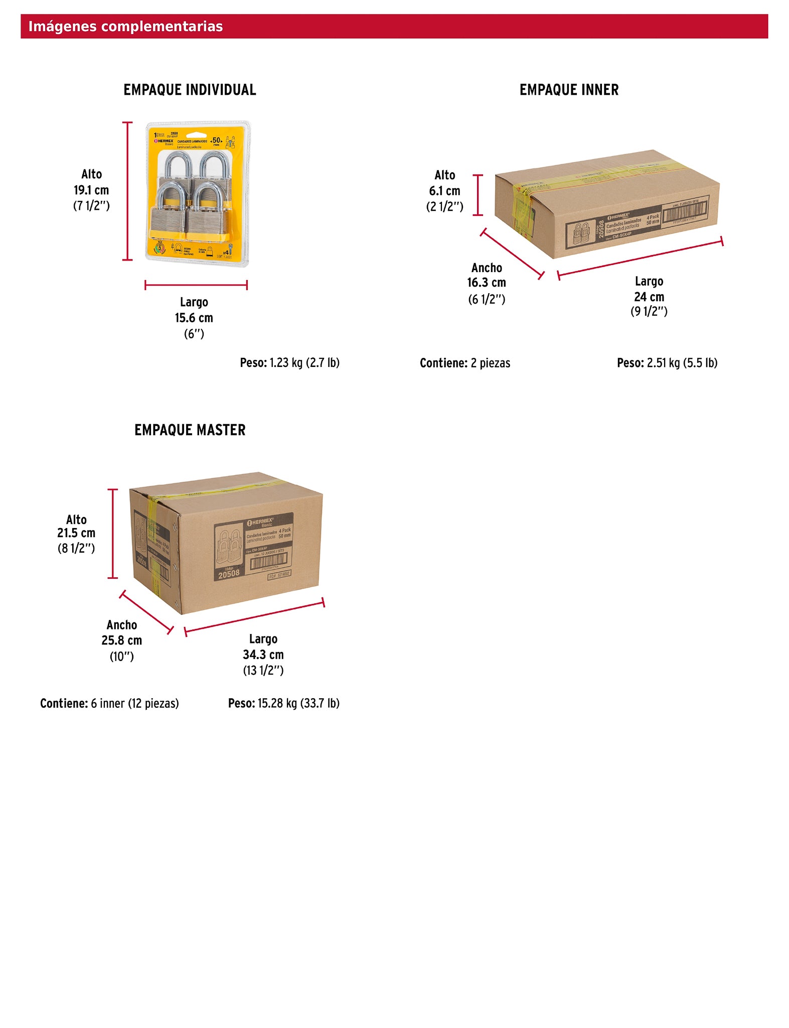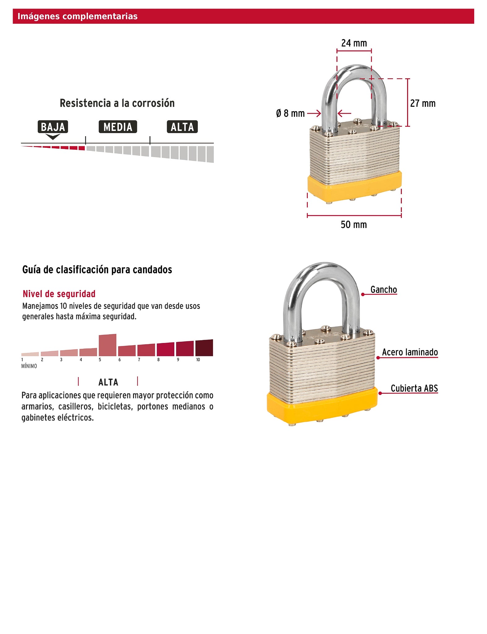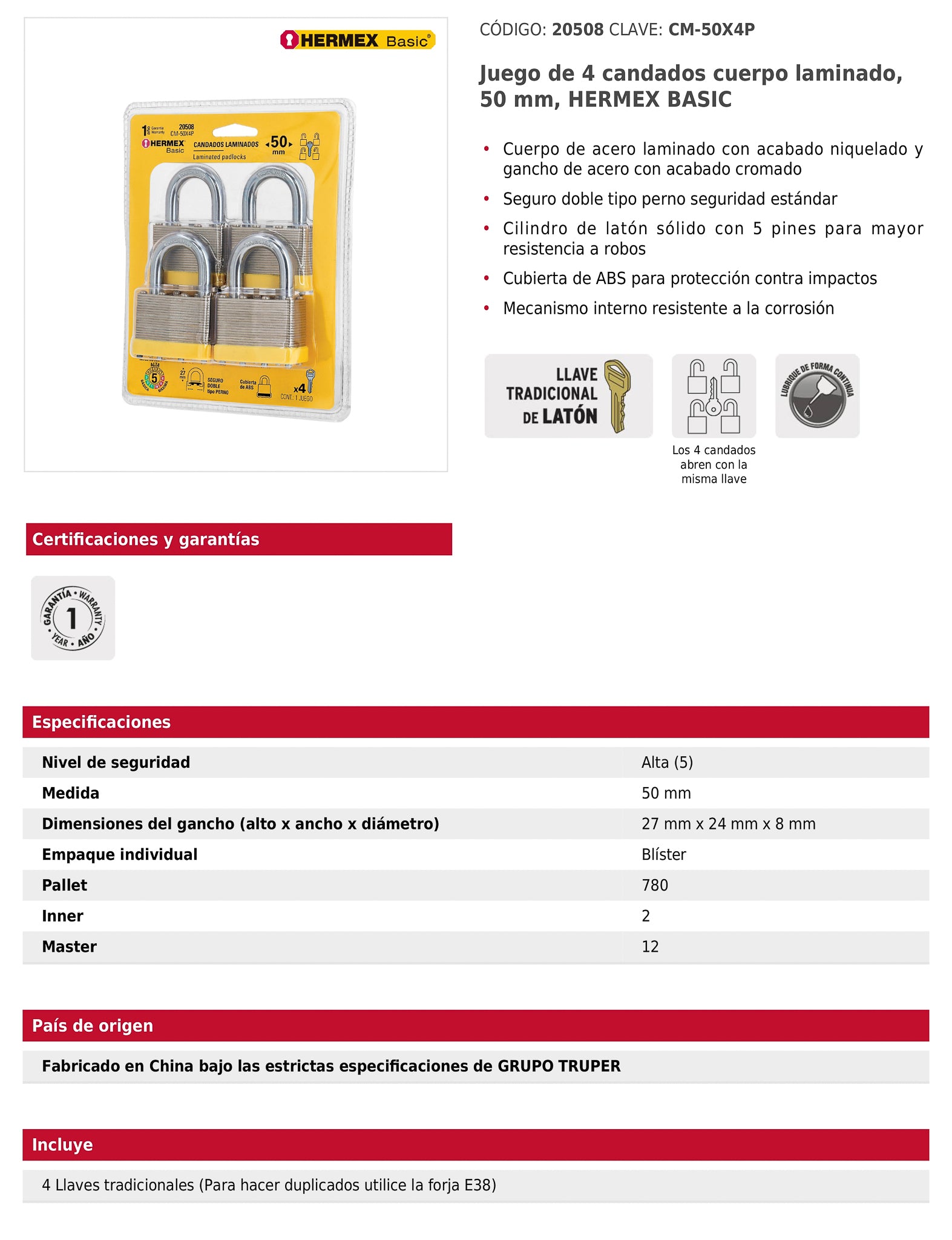 Juego de 4 candados HERMEX BASIC con cuerpo de acero laminado y acabado niquelado, gancho de acero cromado y cubierta de ABS para protección contra impactos. Incluyen cilindro de latón sólido con 5 pines y mecanismo interno resistente a la corrosión. Los cuatro candados abren con la misma llave, ofreciendo conveniencia y seguridad en conjunto.