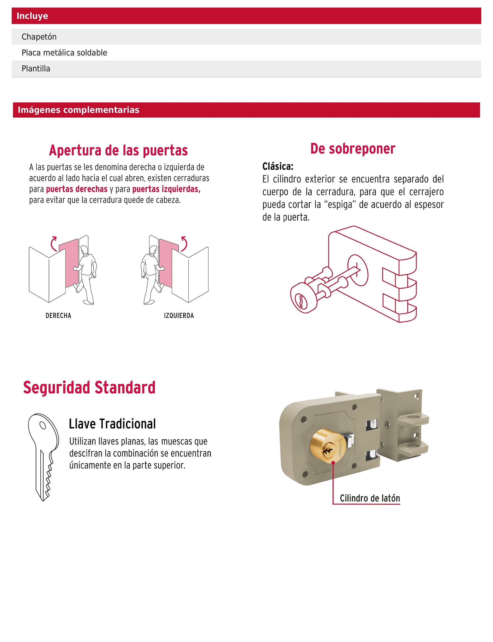 Cerradura de sobreponer con cilindro de latón sólido de 5 pernos y cilindro exterior ajustable. Incluye placa metálica soldable, ideal para instalación en puertas metálicas o de madera con espesor de hasta 60 mm.