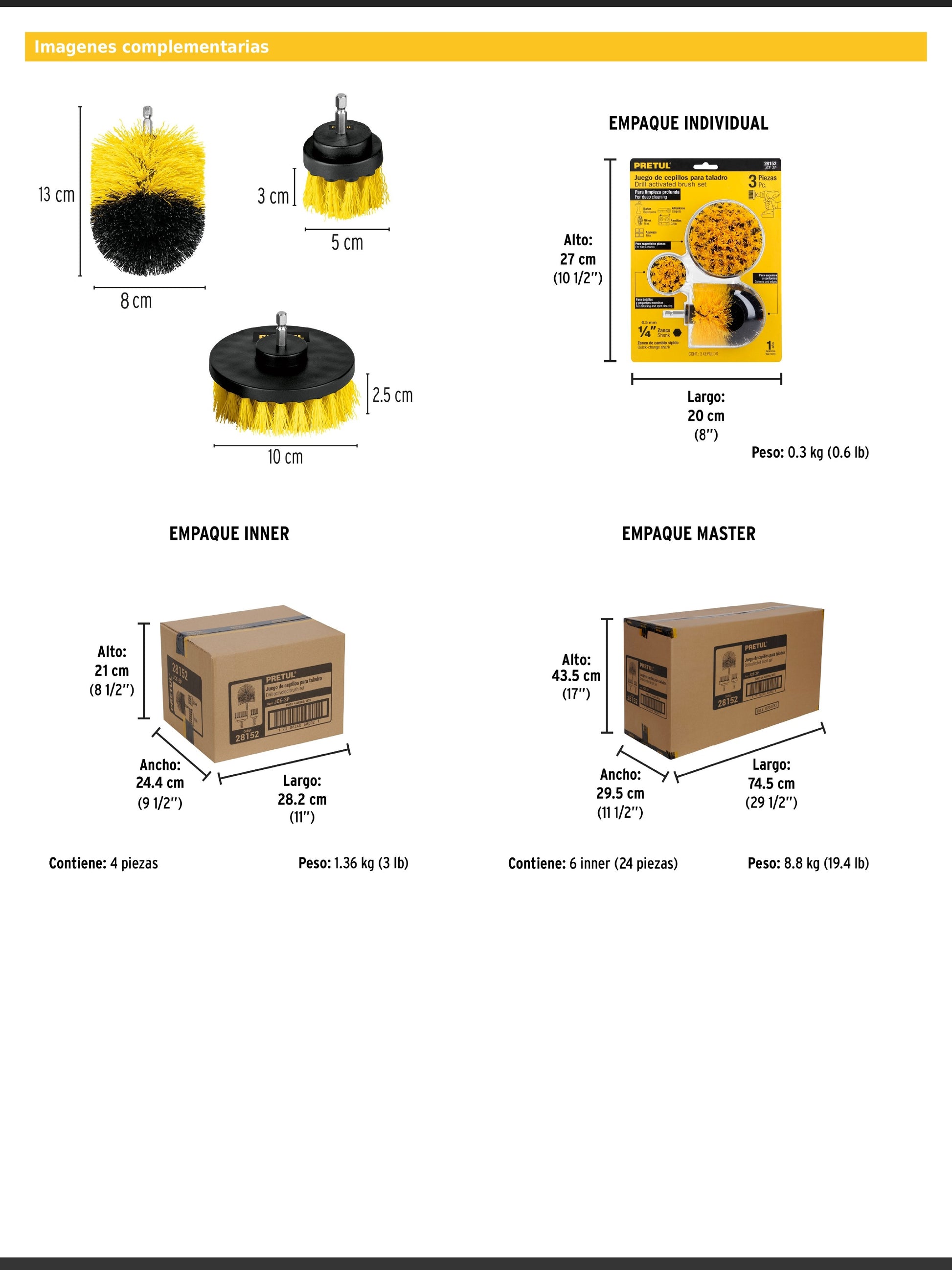 Juego de 3 cepillos multiusos diseñados con cerdas de polipropileno resistentes para limpieza profunda en baños, alfombras, cocinas, rines, parrillas y tapicería. Incluyen zanco de cambio rápido compatible con cualquier taladro, lo que facilita su instalación y uso. Son ideales para esquinas, contornos, detalles y superficies planas, brindando versatilidad en el mantenimiento del hogar y el taller.