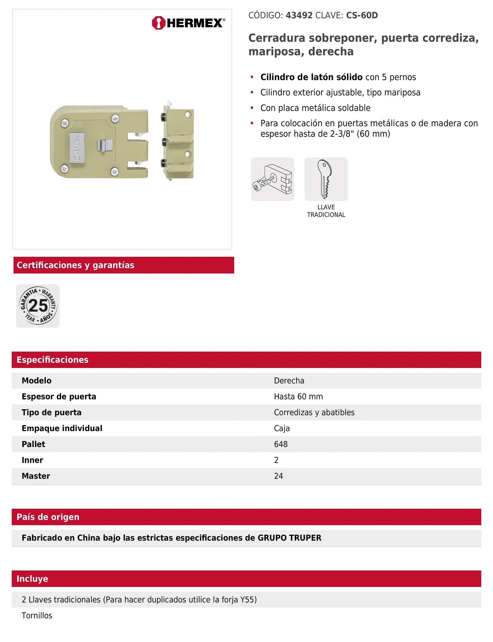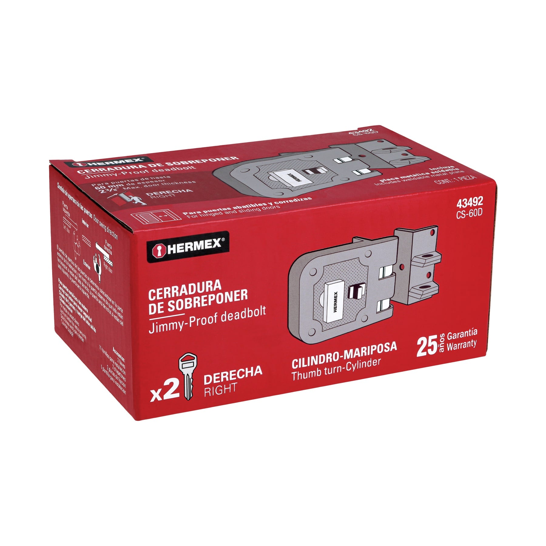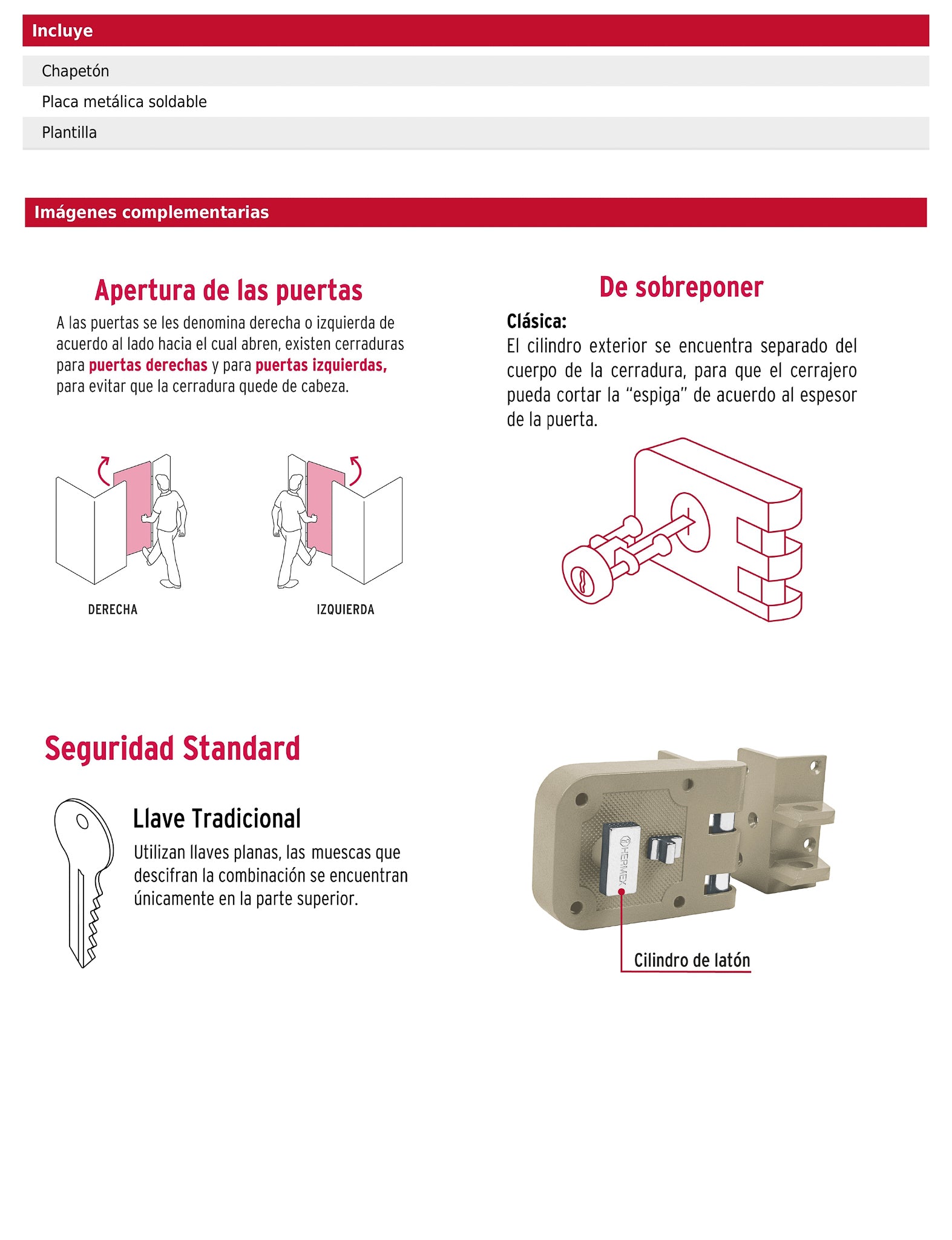 Cerradura de sobreponer con cilindro de latón sólido de 5 pernos y cilindro exterior ajustable tipo mariposa. Cuenta con placa metálica soldable, ideal para puertas metálicas o de madera con espesor de hasta 60 mm.