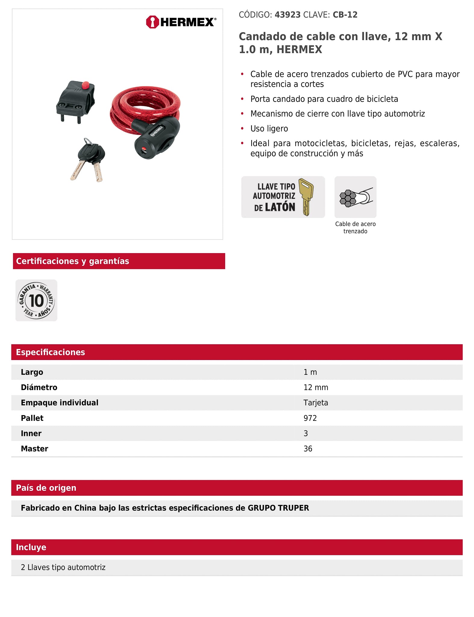Candado de cable de acero trenzado recubierto con PVC para mayor resistencia a cortes. Incluye porta candado para cuadro de bicicleta y mecanismo de cierre con llave tipo automotriz. Ideal para motocicletas, bicicletas, rejas, escaleras y equipos de construcción, brindando seguridad ligera, práctica y confiable.