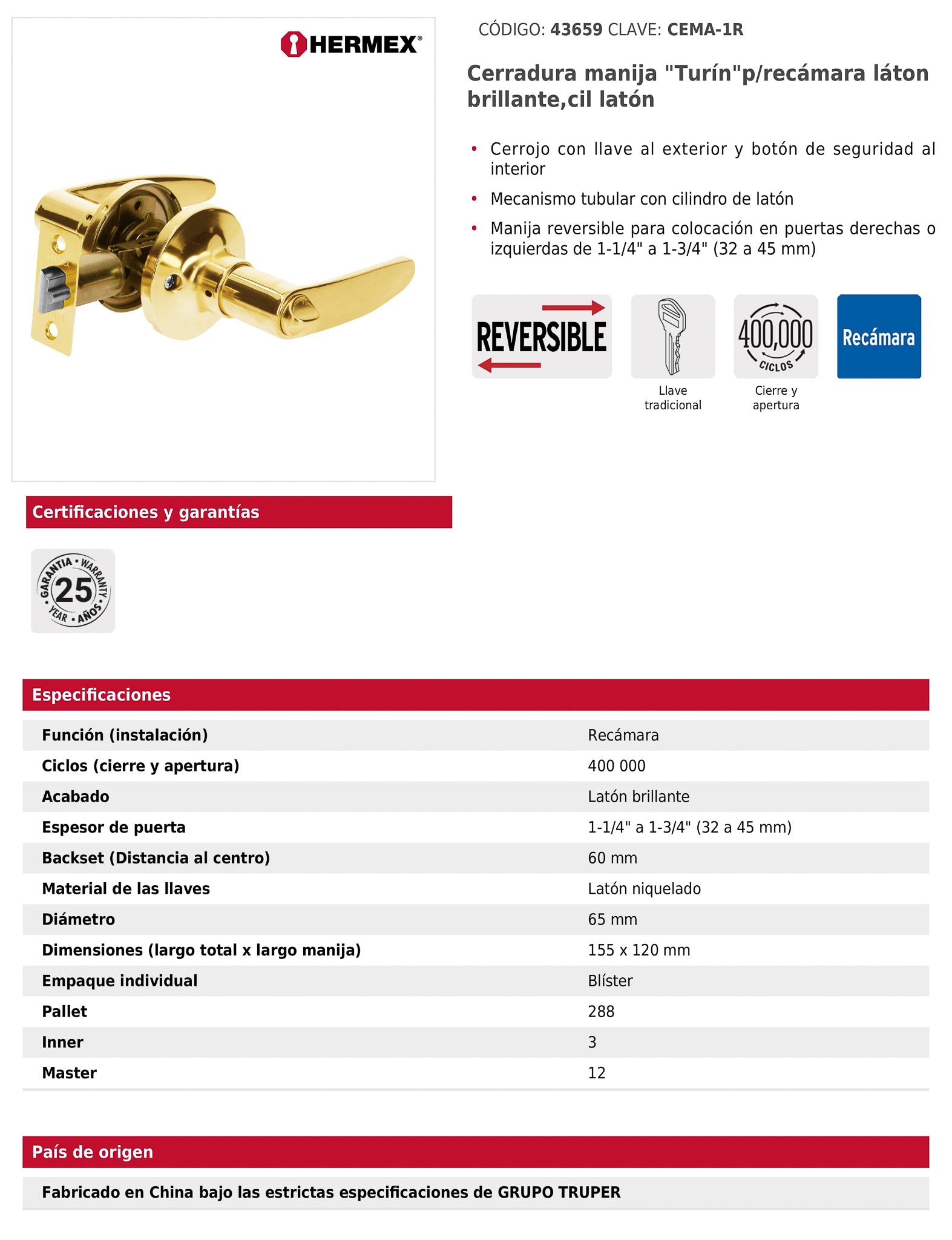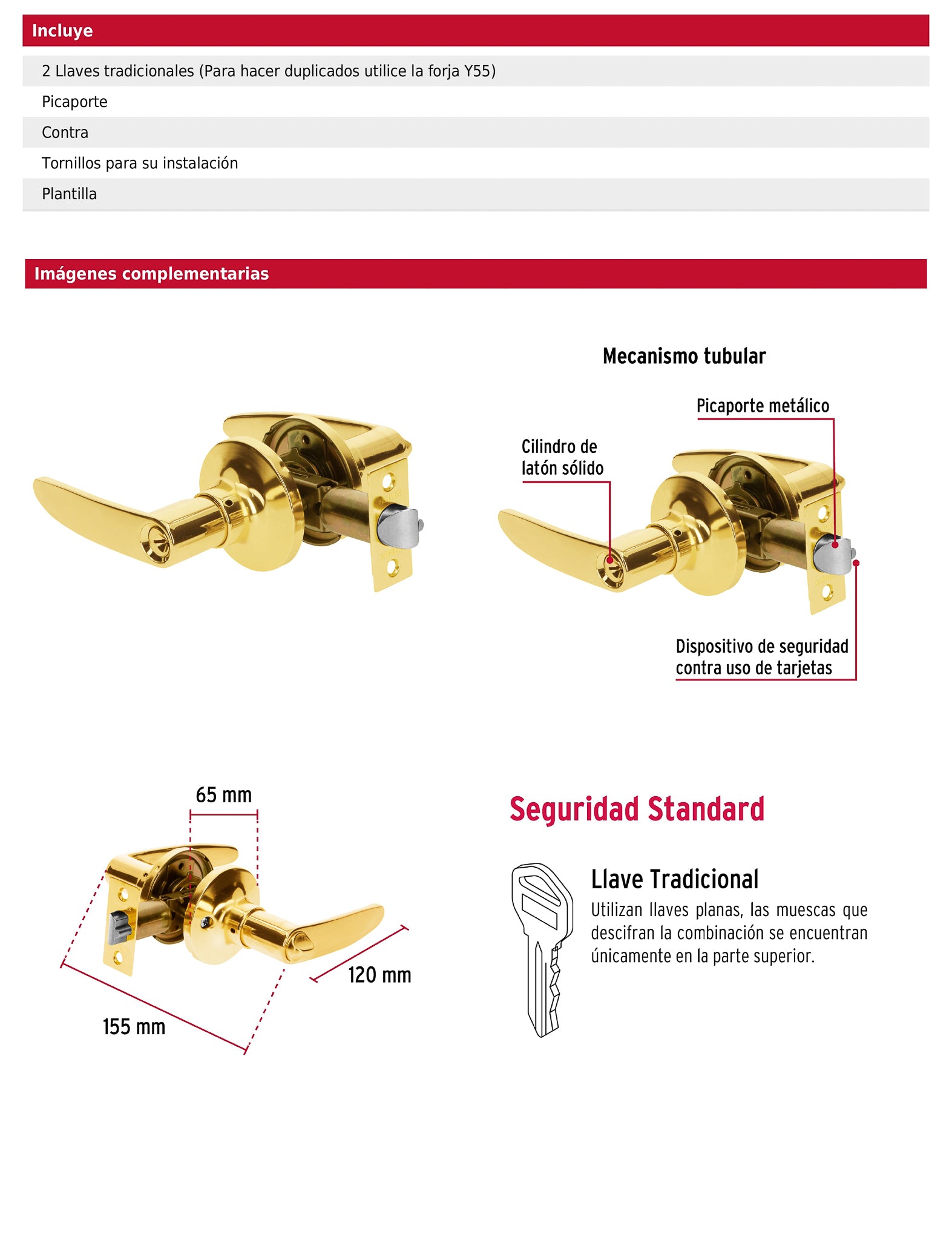 Cerradura con cerrojo de llave al exterior y botón de seguridad al interior. Su mecanismo tubular con cilindro de latón ofrece un cierre seguro y resistente. Además, su manija reversible permite instalación en puertas derechas o izquierdas con espesor de 32 a 45 mm.