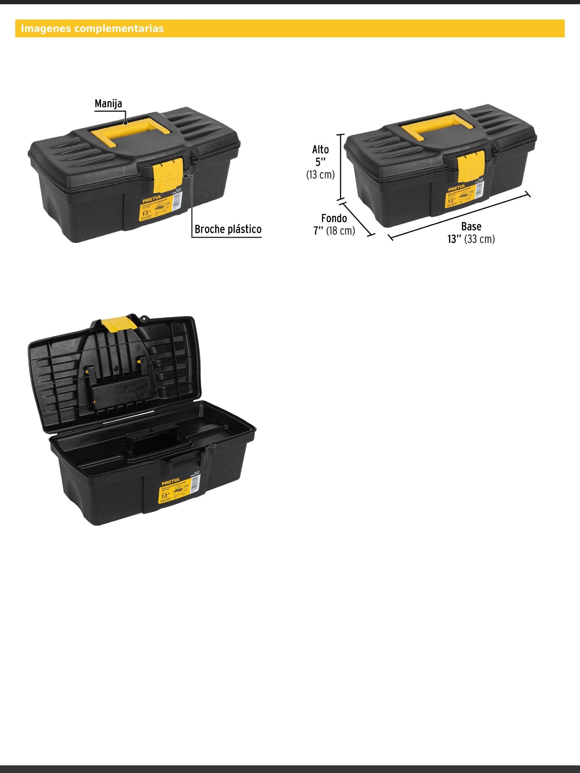 Caja para herramienta fabricada en polipropileno con broche plástico y manija ergonómica que permite transportar cómodamente. Incluye charola para mejor organización interna.
