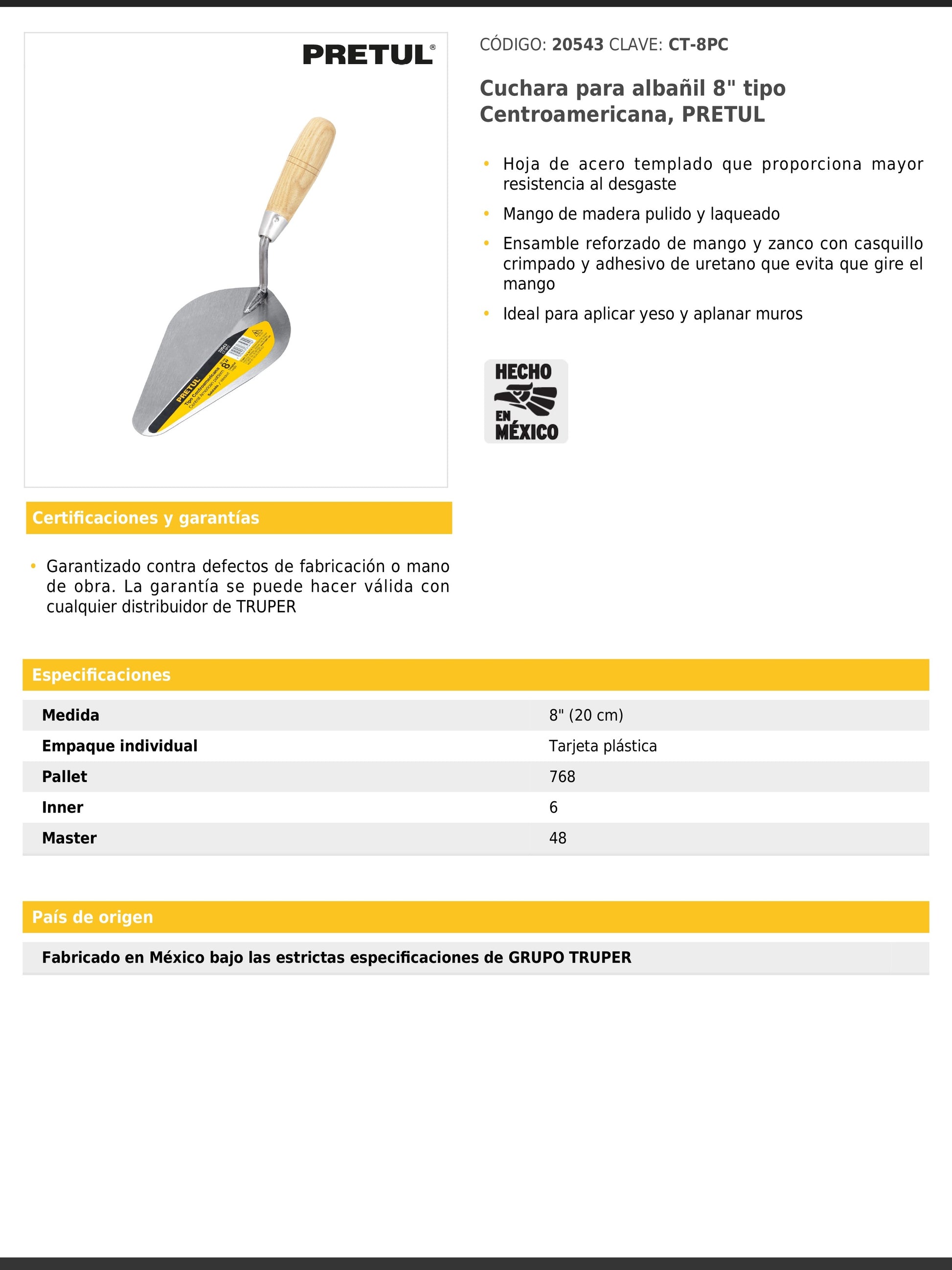 Cuchara para albañil de 8 pulgadas tipo Centroamericana