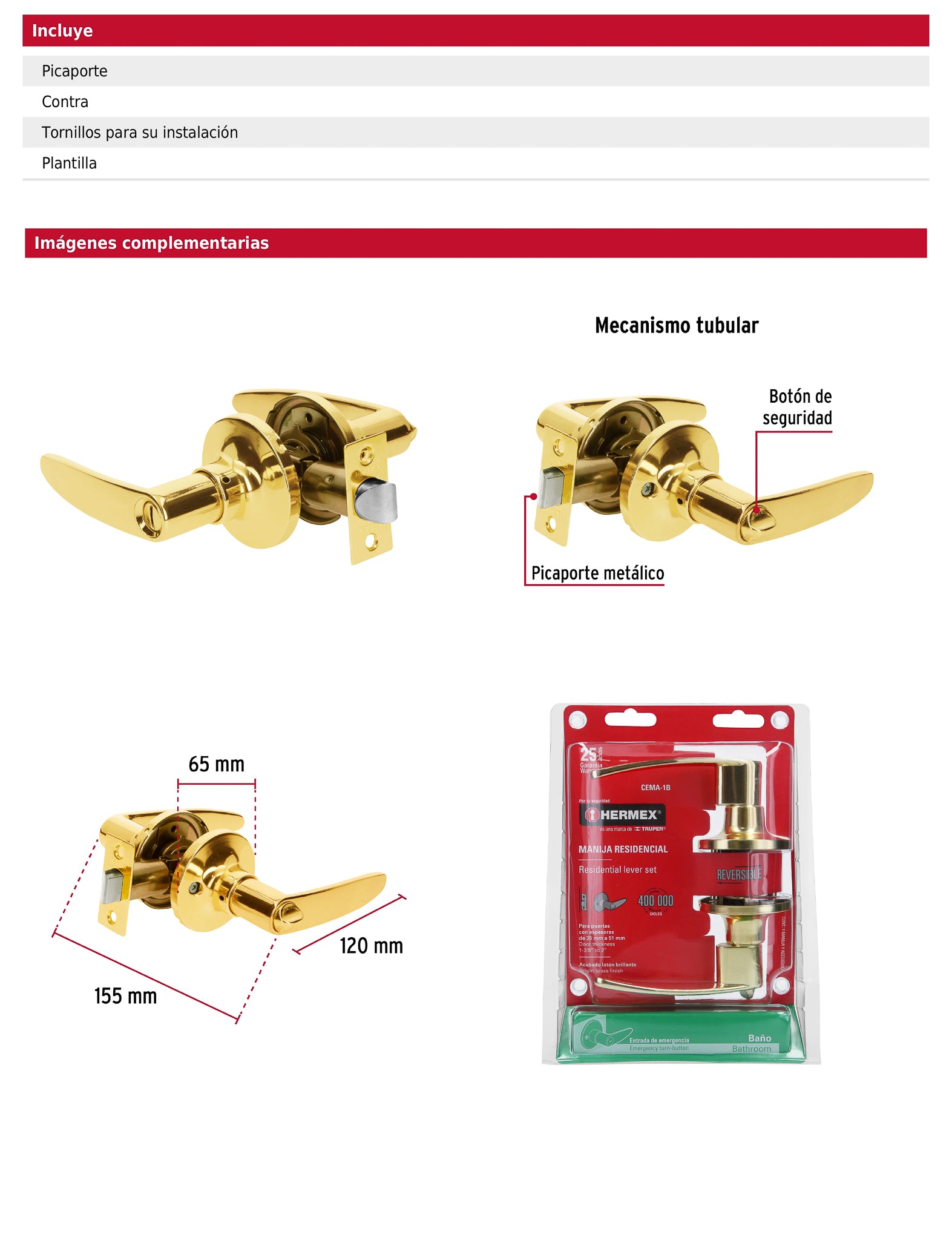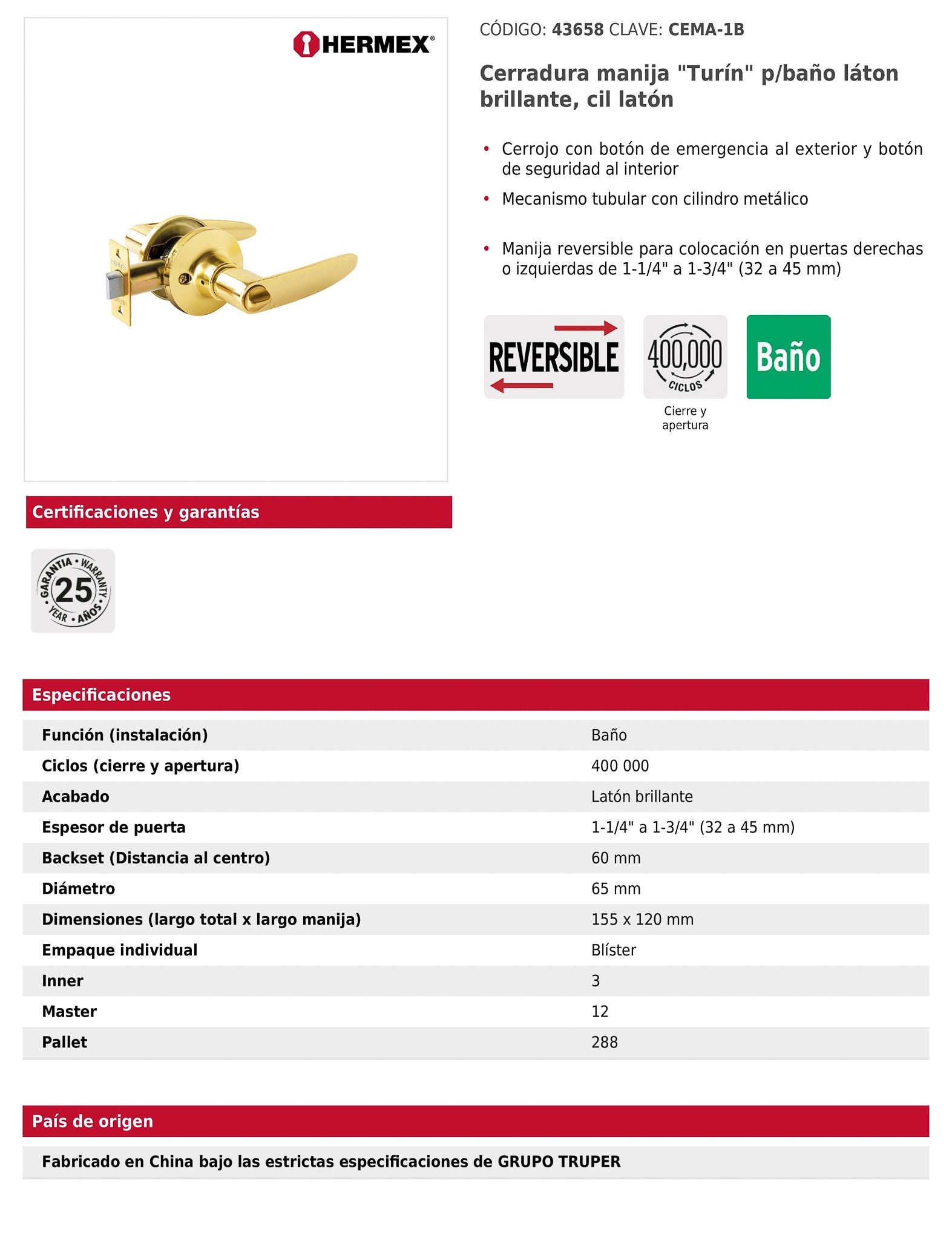 Cerradura con cerrojo de botón de emergencia al exterior y botón de seguridad al interior. Incorpora un mecanismo tubular con cilindro metálico y manija reversible, ideal para instalación en puertas derechas o izquierdas con espesor de 32 a 45 mm.
