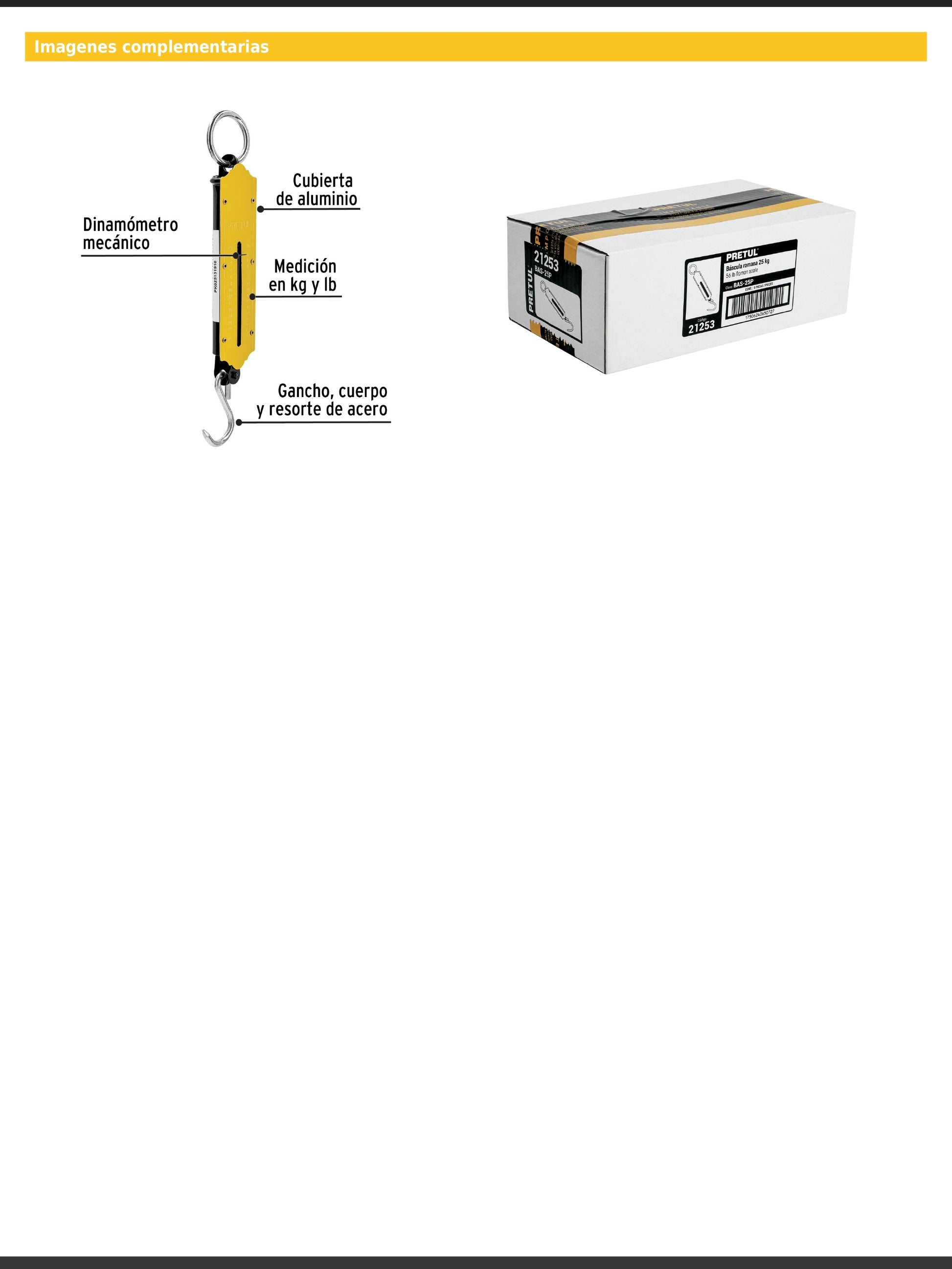 Báscula tipo romana con mecanismo de resorte, fabricada con gancho, cuerpo y resorte de acero y cubierta de aluminio. Funciona como dinamómetro mecánico y permite medición en kilogramos y libras.