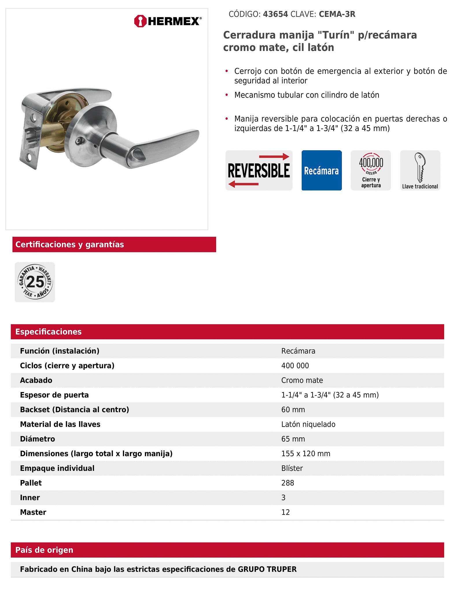 - Espesor de puerta 32 a 45 mm (1-1/4" a 1-3/4").