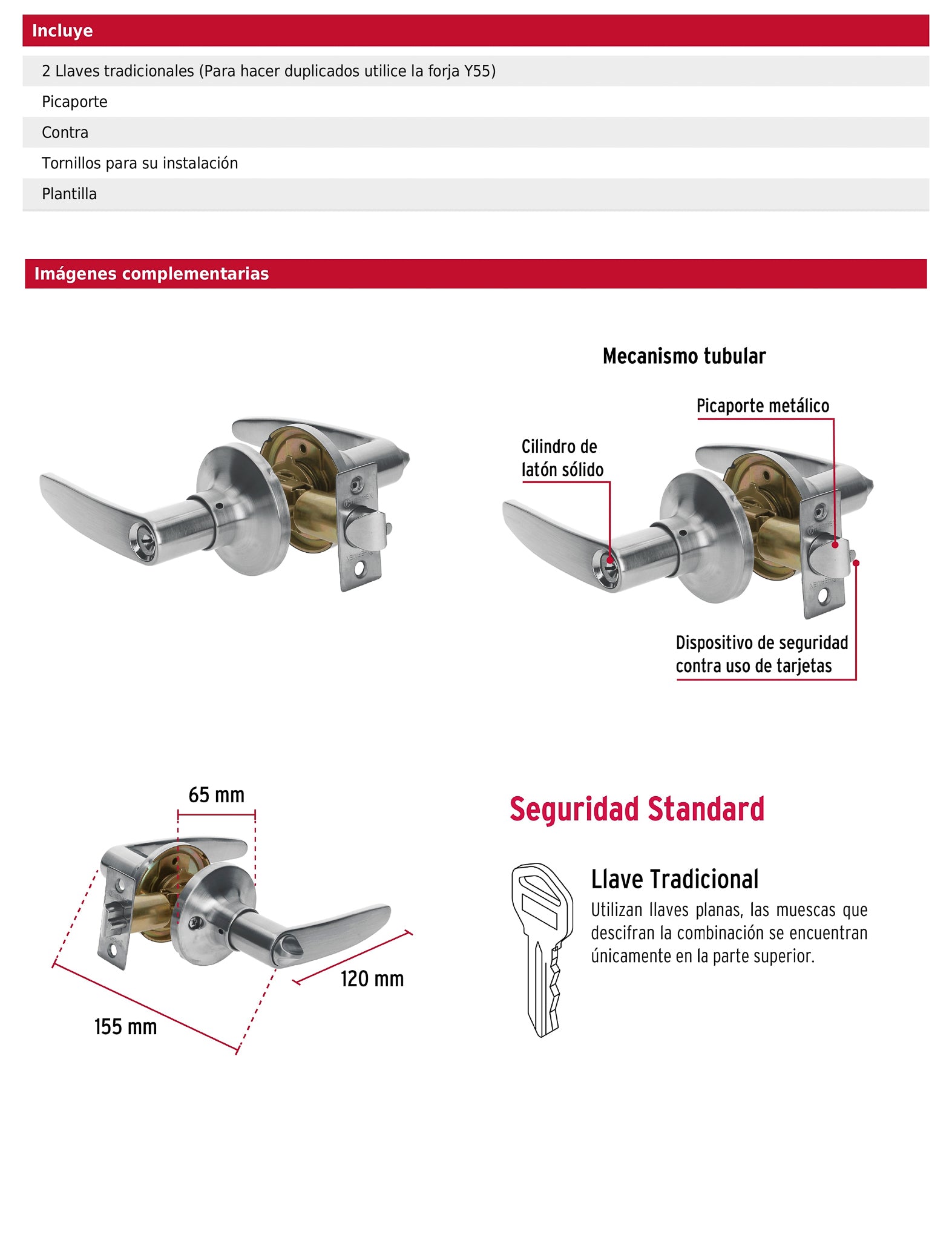 Cerradura con cerrojo de botón de emergencia al exterior y botón de seguridad al interior. Su mecanismo tubular con cilindro de latón ofrece durabilidad y resistencia. La manija es reversible, apta para puertas derechas o izquierdas con espesor de 32 a 45 mm.