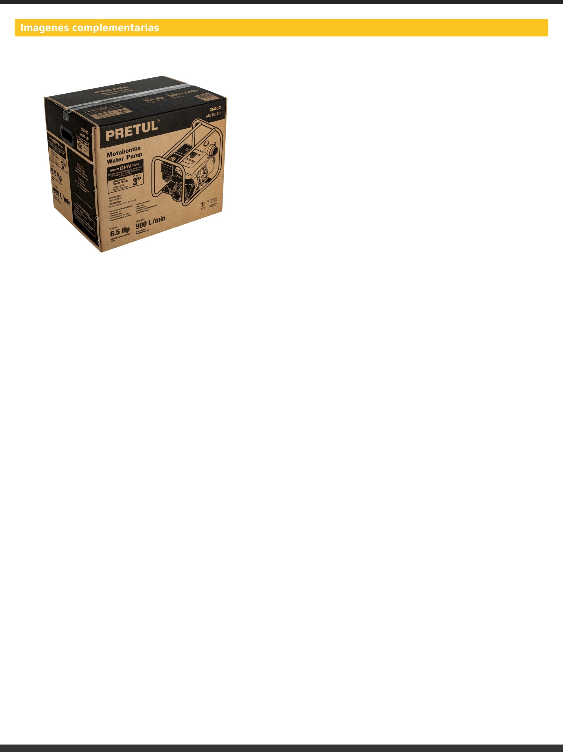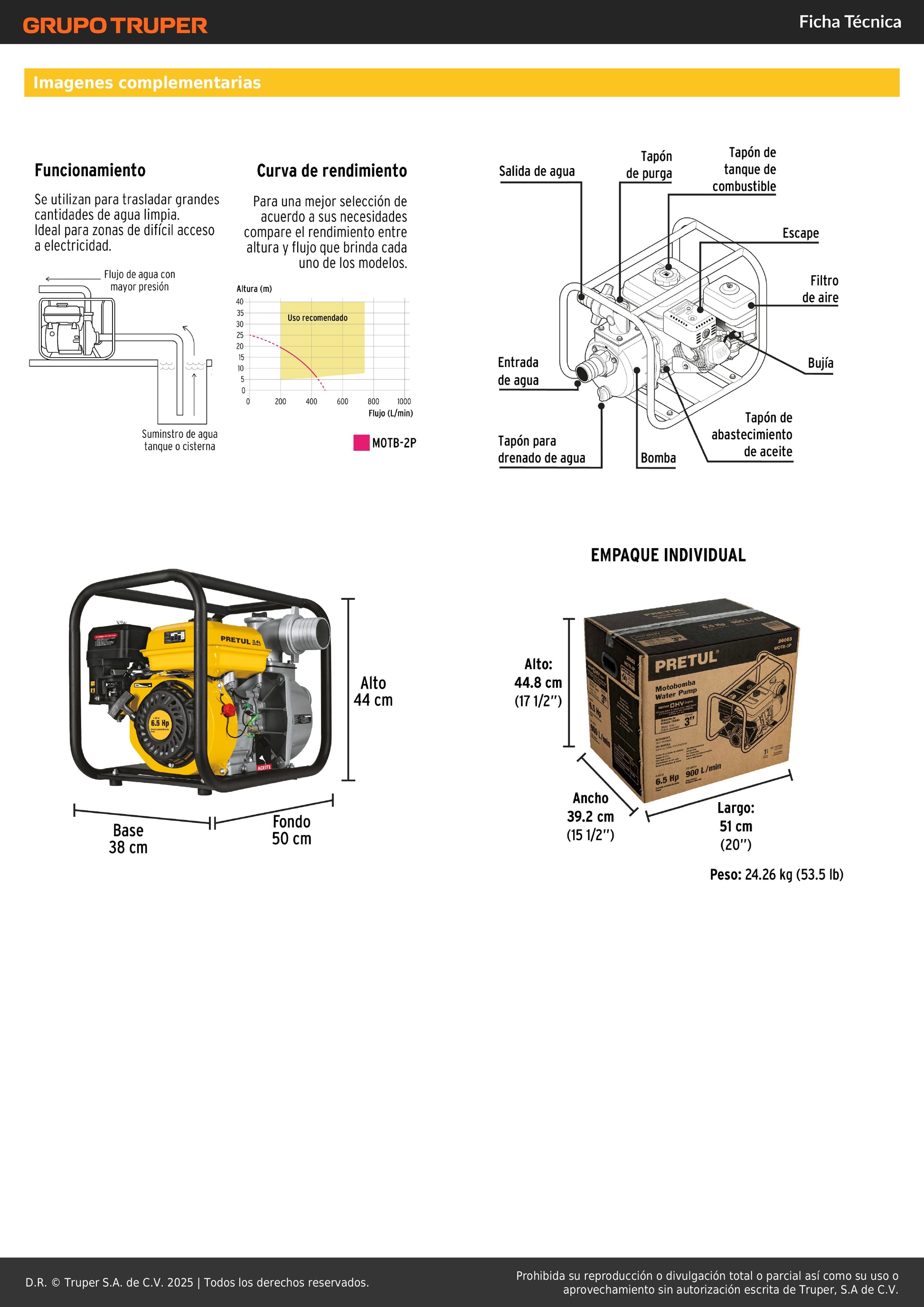 Motobomba diseñada para trasladar grandes cantidades de agua limpia en zonas sin acceso a electricidad. Cuenta con motor OHV de 6.5 HP a 4 tiempos, que no requiere mezcla de aceite y gasolina. Ofrece altura máxima de bombeo de 25 m, flujo de hasta 900 L/min, succión máxima de 5 m y sensor de nivel bajo de aceite. Incluye carcasa de aluminio e impulsor de hierro, con arranque manual retráctil.
