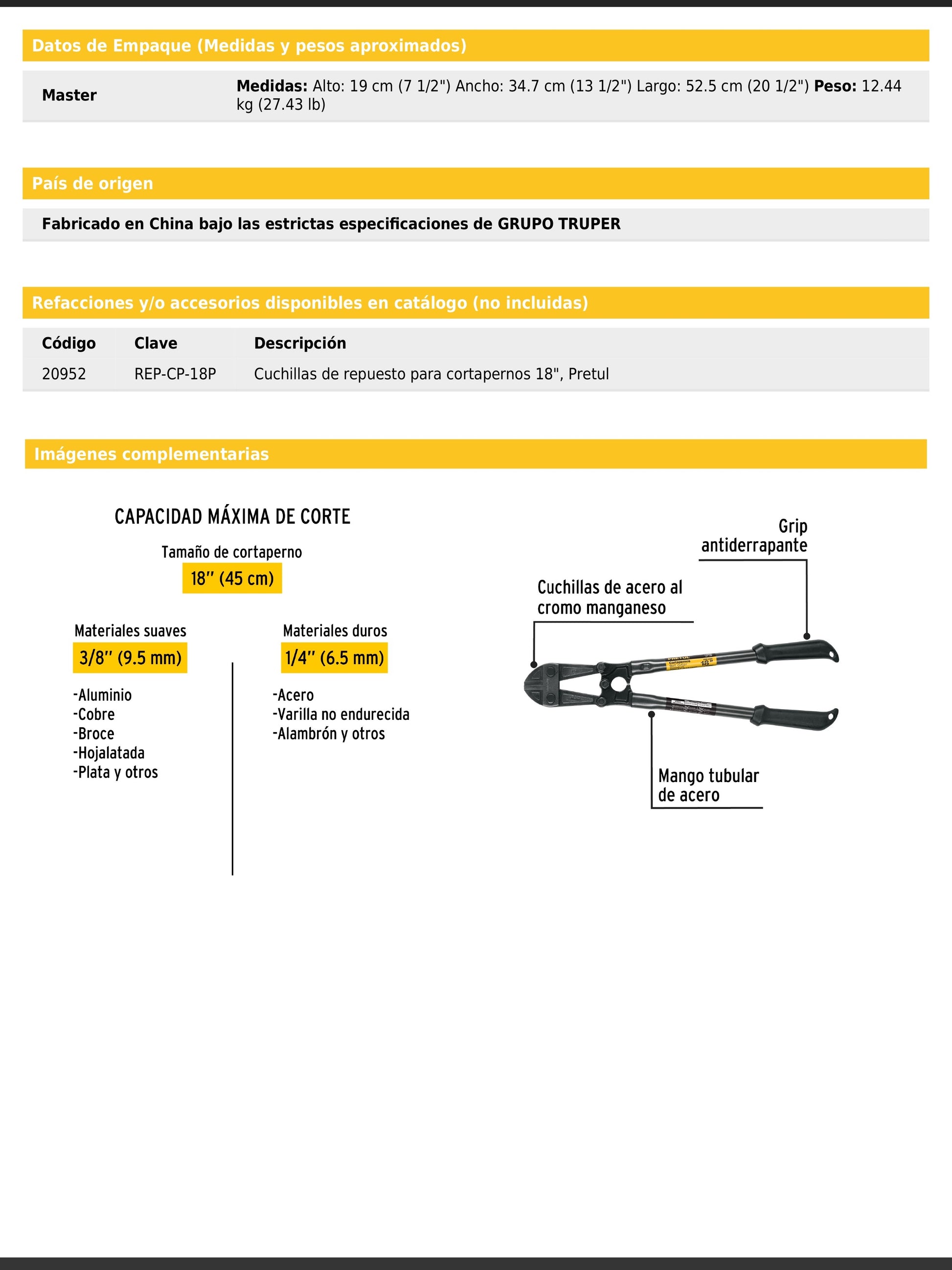 - Refacción disponible: Cuchillas de repuesto código 20952 (REP-CP-18P).
