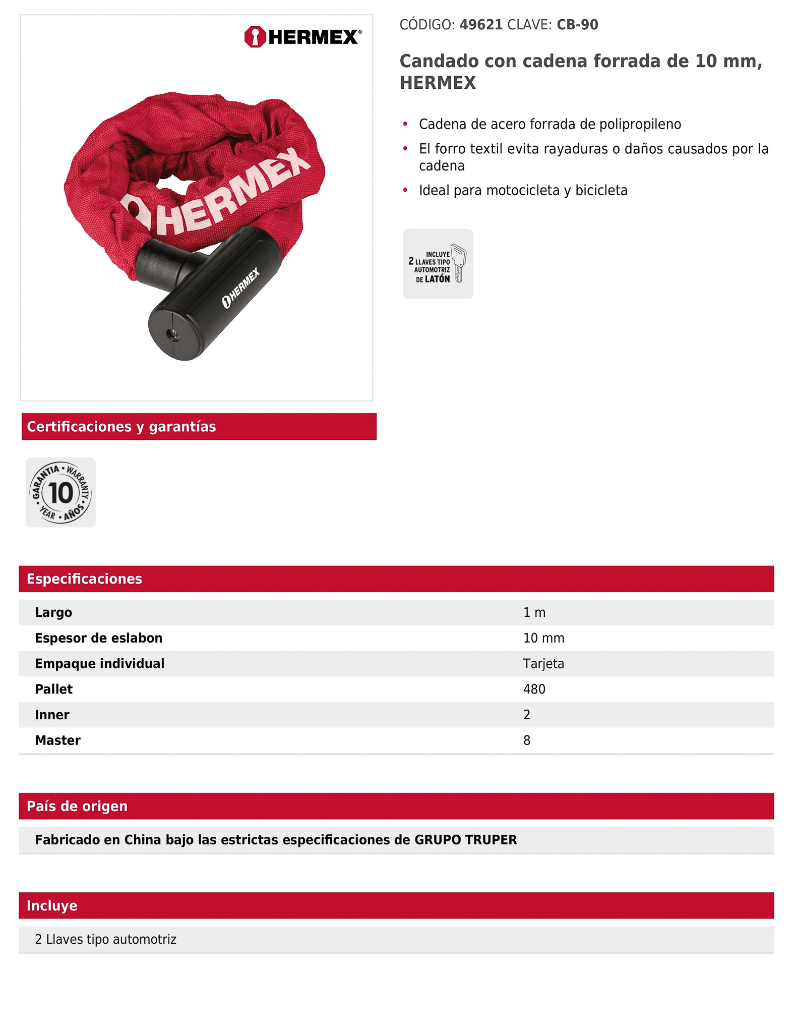 Candado con cadena de acero forrada de polipropileno, diseñado para proteger motocicletas y bicicletas. El forro textil evita rayaduras o daños causados por la cadena, ofreciendo una mayor durabilidad y cuidado del vehículo. Incluye dos llaves tipo automotriz para un uso práctico y seguro.