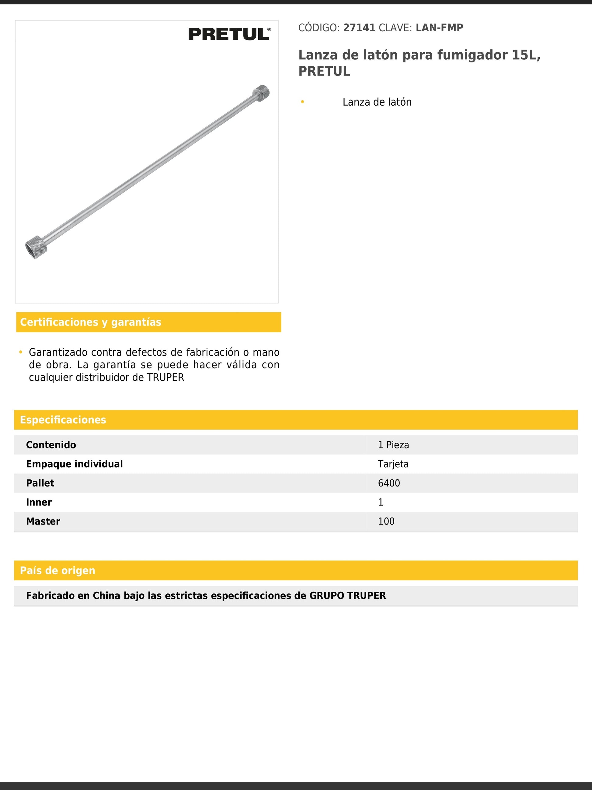 Lanza fabricada en latón, diseñada para fumigadores de 15 L. Proporciona resistencia y durabilidad, asegurando un flujo constante y eficiente durante las aplicaciones.