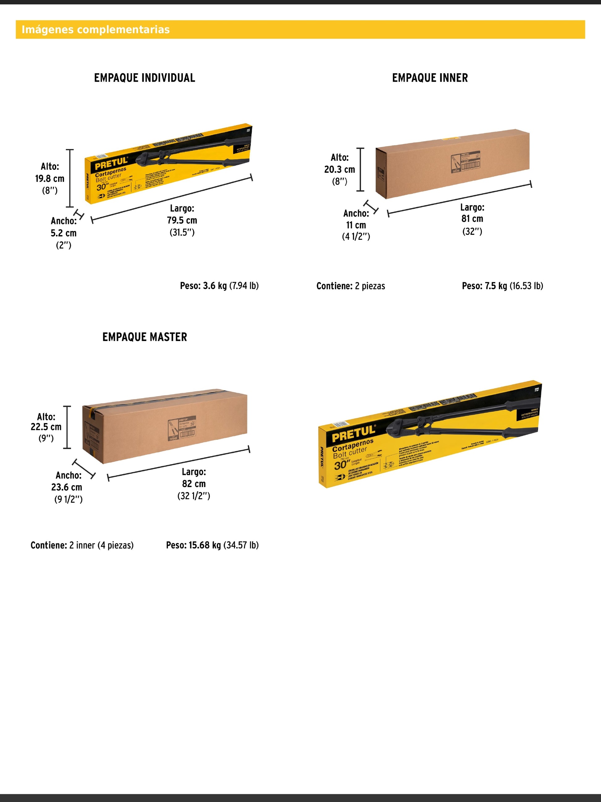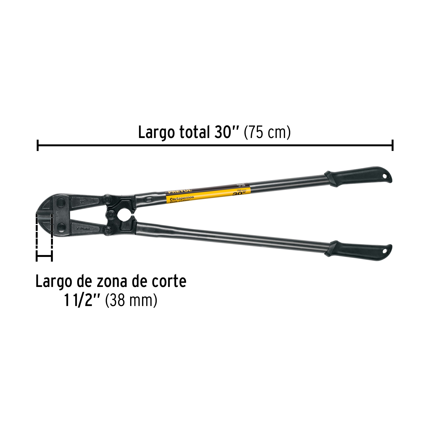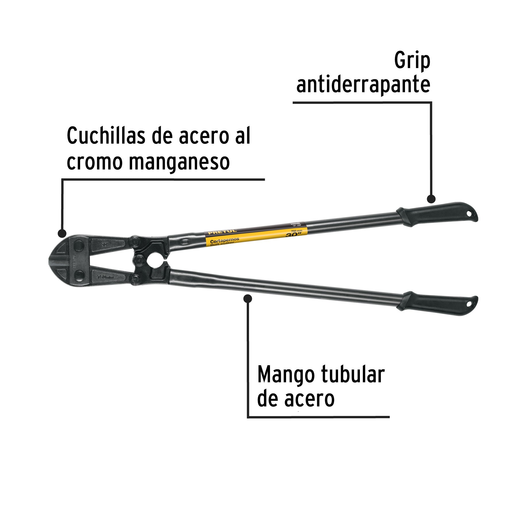 Cortapernos fabricado con cuchillas de acero al cromo manganeso, forjadas y templadas para mayor resistencia y durabilidad. Cuenta con mango tubular de acero con grip antiderrapante y tornillos de ajuste para asegurar precisión y alineación de las cuchillas. Incorpora un mecanismo de palanca de 3 puntos que multiplica la presión aplicada hasta 50 veces. Excede la norma de Especificación Federal GGG-C-740d y se presenta en empaque individual tipo caja.