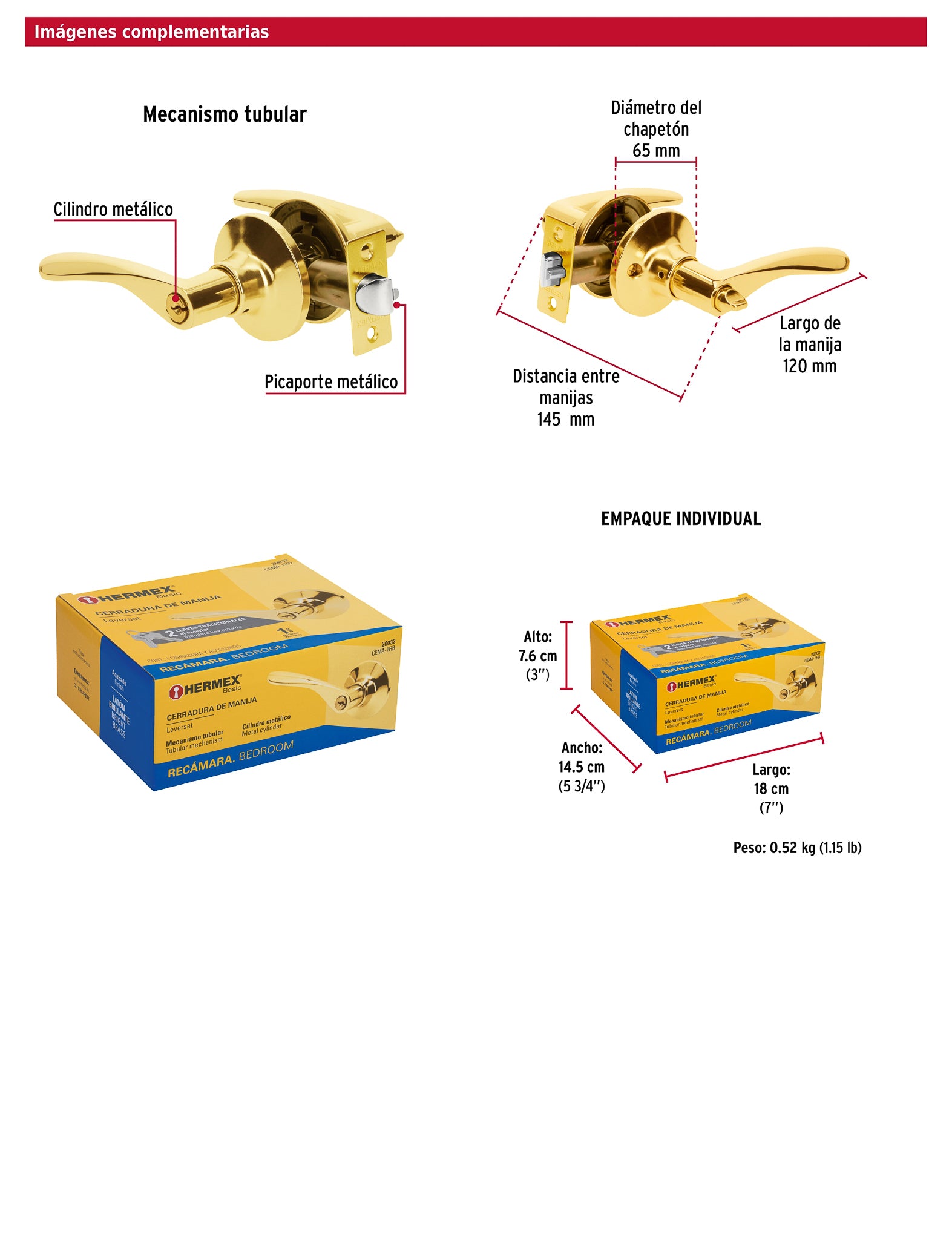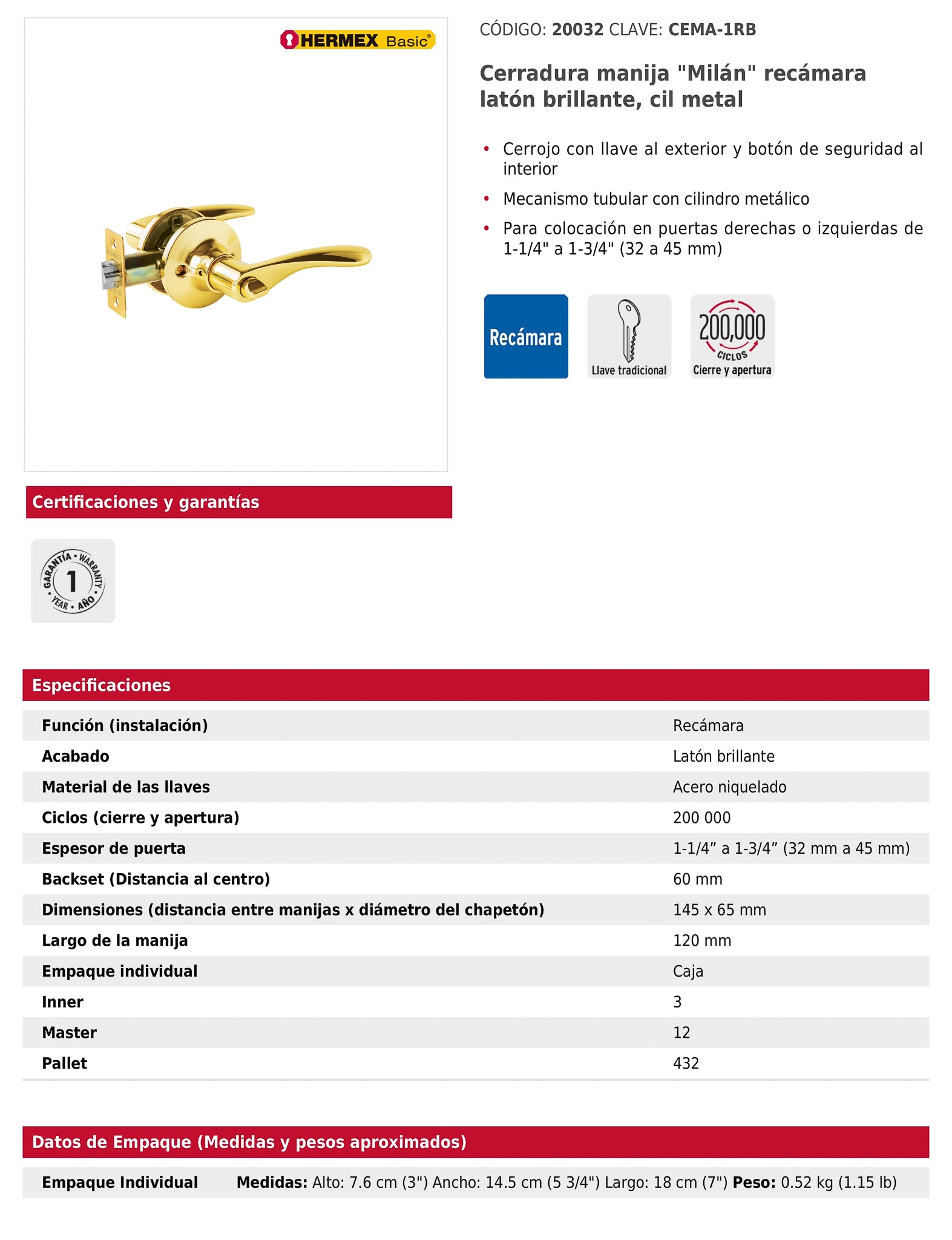 Cerradura para recámara con cerrojo de llave al exterior y botón de seguridad al interior, mecanismo tubular con cilindro metálico y compatibilidad con puertas derechas o izquierdas de 32 a 45 mm de espesor; incluye 2 llaves tradicionales (forja R1), picaporte, contra, tornillos y plantilla de instalación.