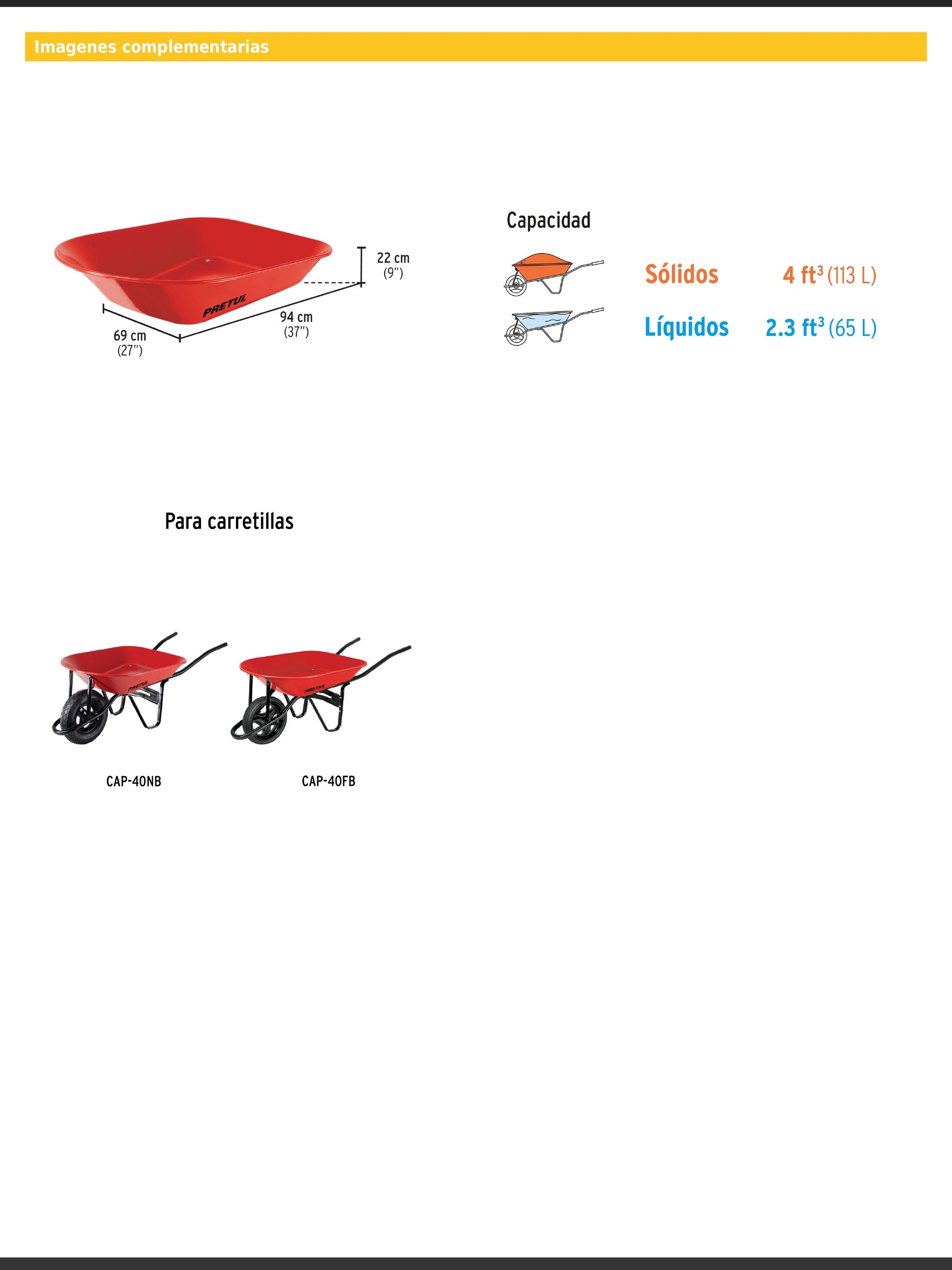 Concha metálica fabricada en acero calibre 23 (0.7 mm), diseñada como repuesto para carretillas modelo CAP-40 de la marca Pretul. Ofrece capacidad copeteada de 4 ft³ (113 L) y capacidad ras de 2.3 ft³ (65 L).