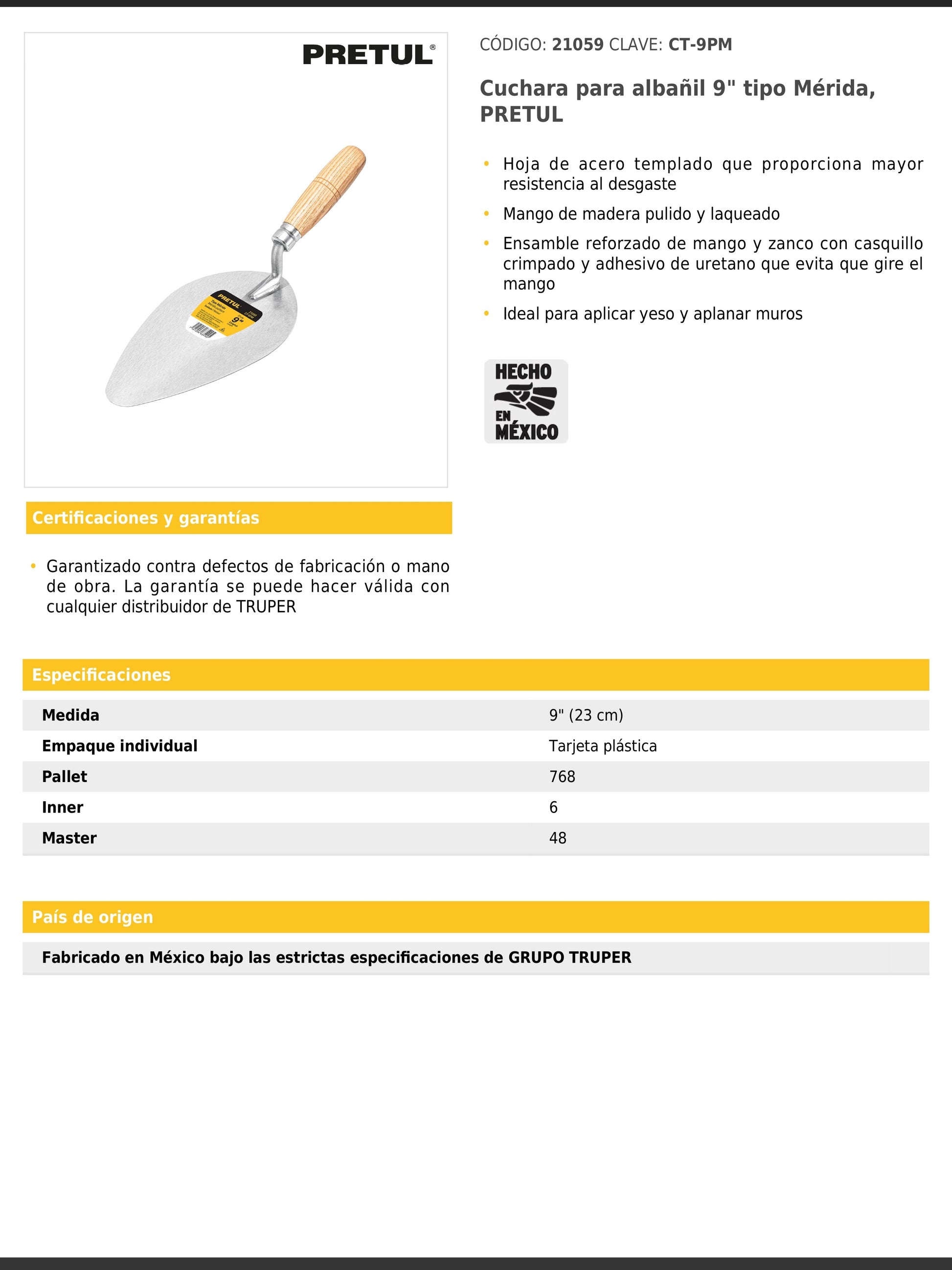Cuchara para albañil con hoja de acero templado que brinda mayor resistencia al desgaste. Cuenta con mango de madera pulido y laqueado, ensamblado con casquillo crimpado y adhesivo de uretano que evita que gire. Ideal para aplicar yeso y aplanar muros.