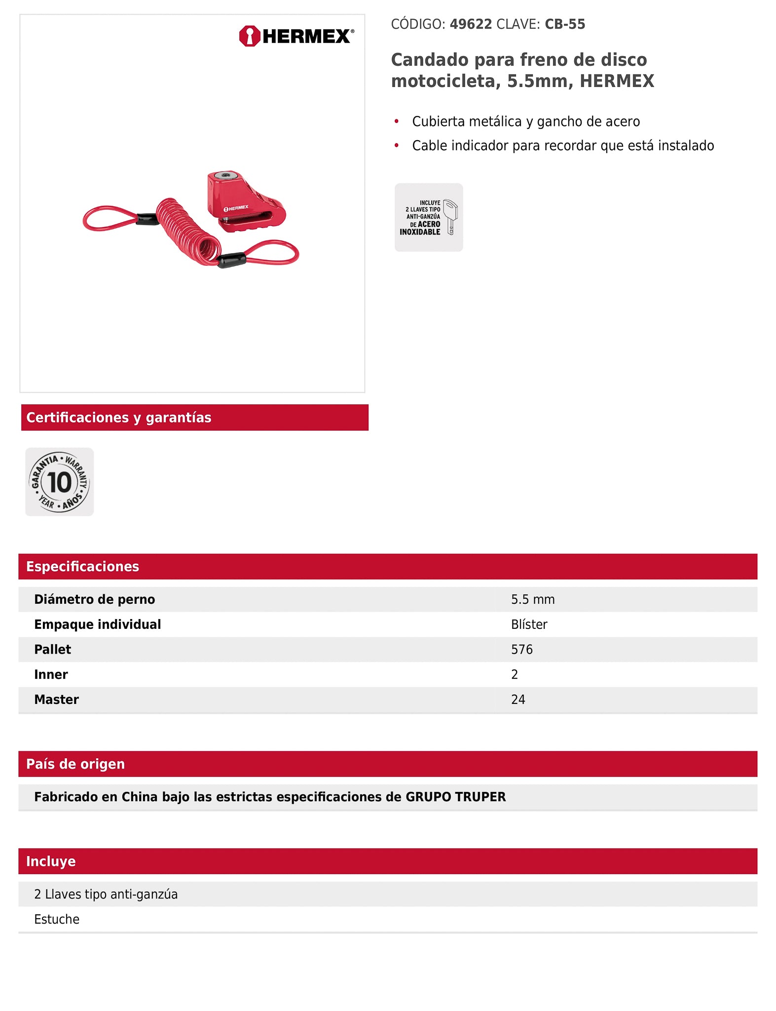 Candado de seguridad para freno de disco de motocicleta, con cubierta metálica y gancho de acero de alta resistencia. Incluye cable indicador para recordar que está instalado, además de dos llaves tipo anti-ganzúa y estuche. Ideal para proteger motocicletas con un sistema compacto, confiable y de fácil uso.