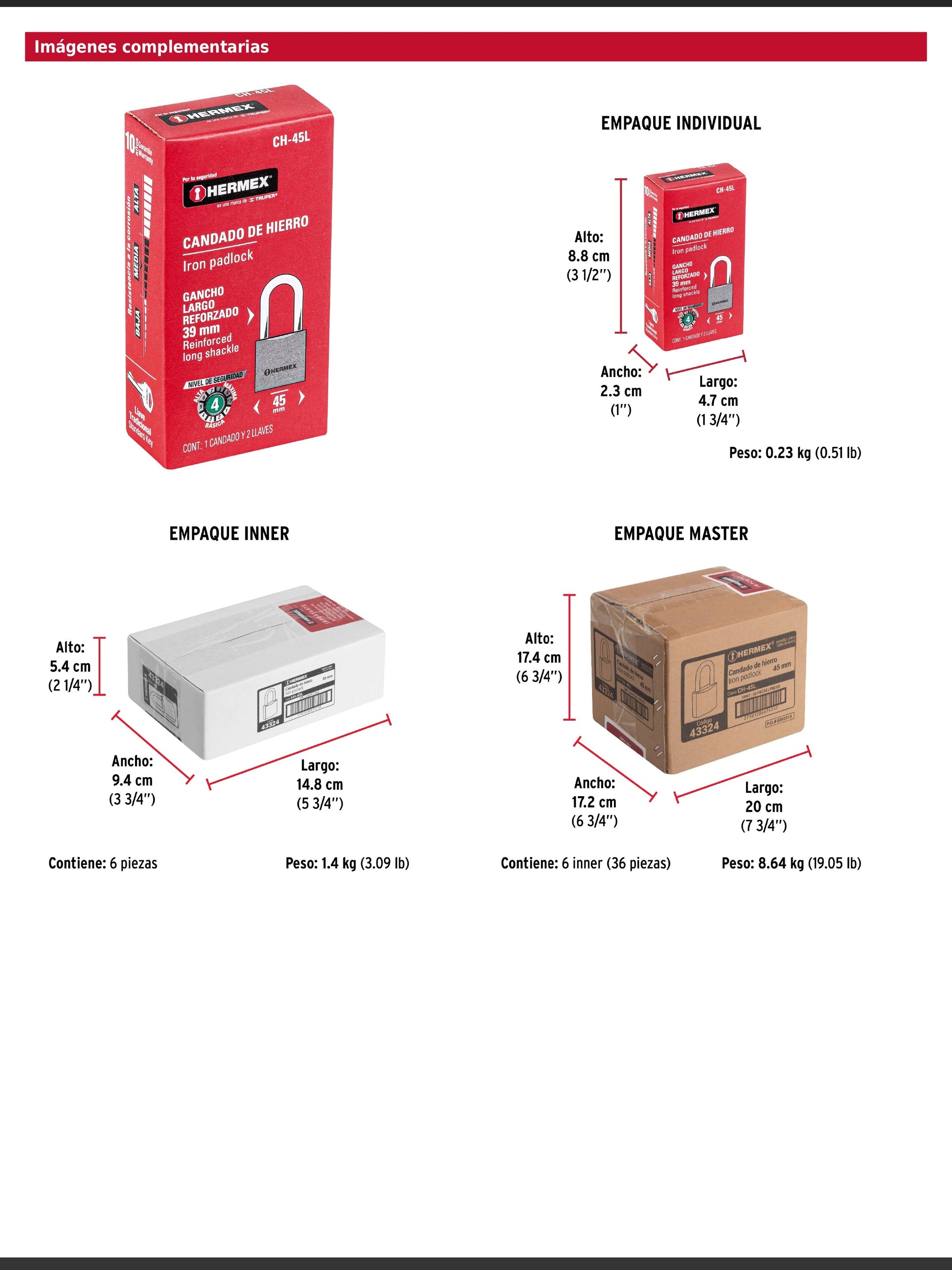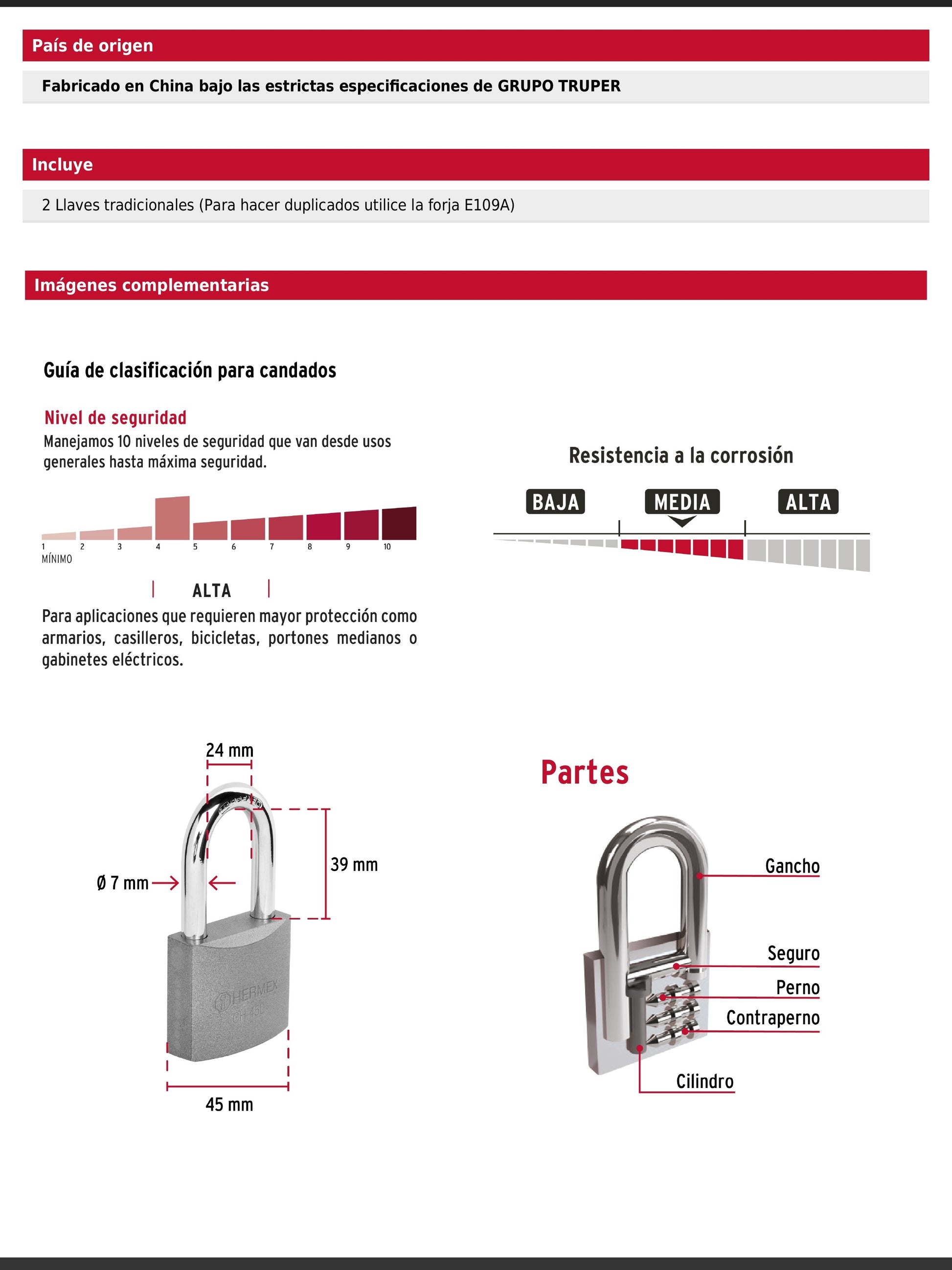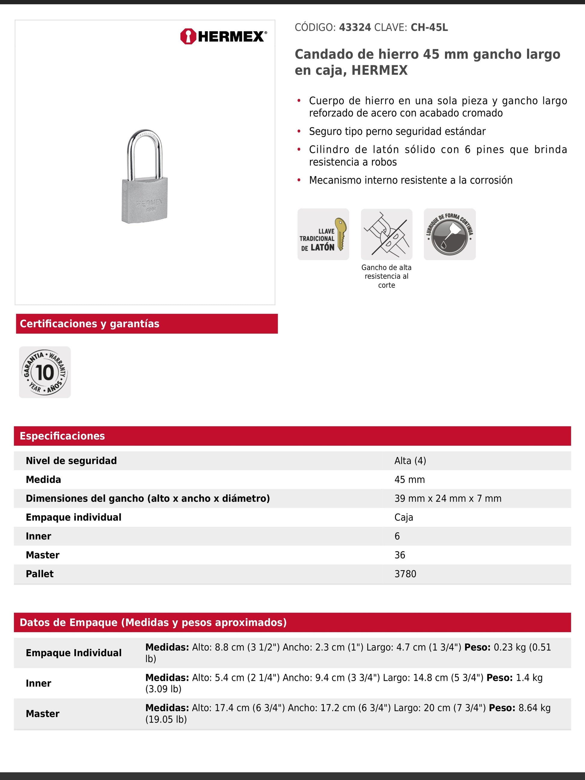 Candado de hierro en una sola pieza con acabado resistente y gancho largo reforzado de acero cromado. Incorpora un cilindro de latón sólido con 6 pines y seguro tipo perno estándar que brindan mayor resistencia a robos. Su mecanismo interno es resistente a la corrosión e incluye 2 llaves tradicionales. Se presenta en empaque individual tipo caja.