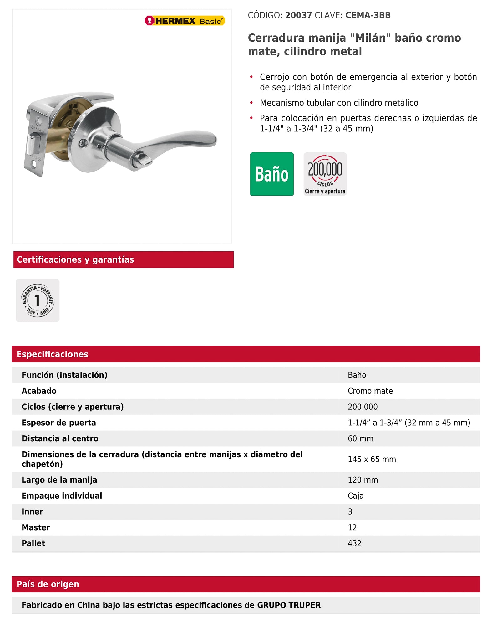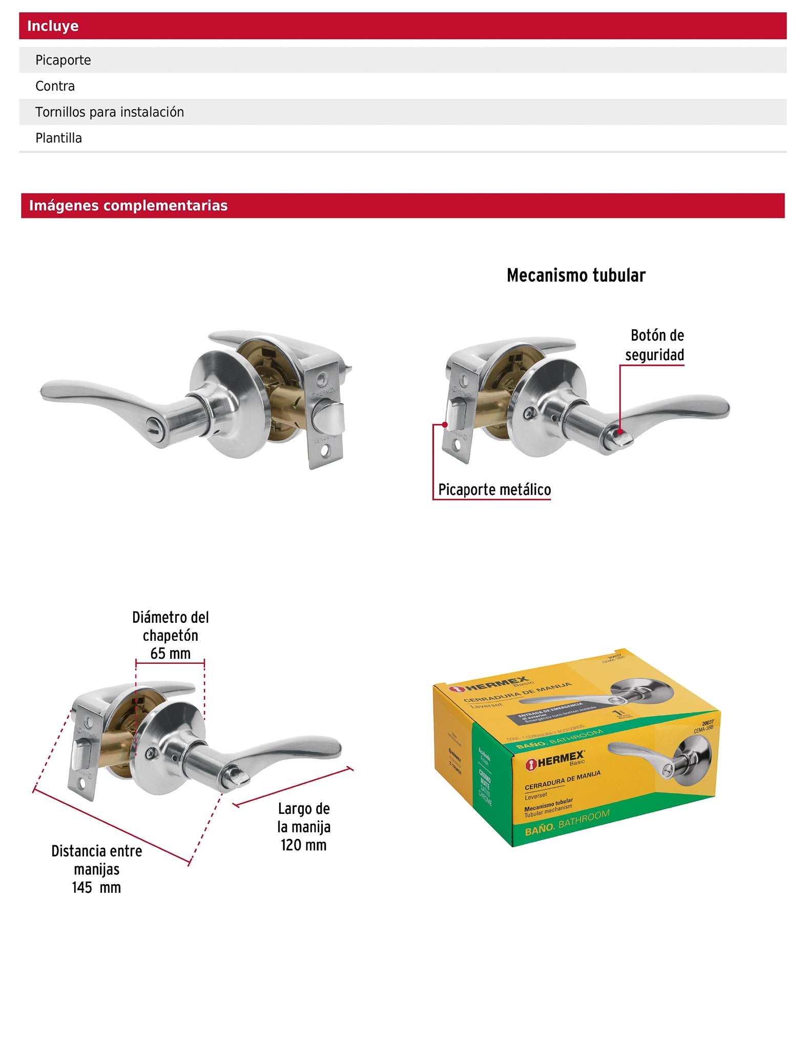 - Incluye picaporte, contra, tornillos y plantilla.