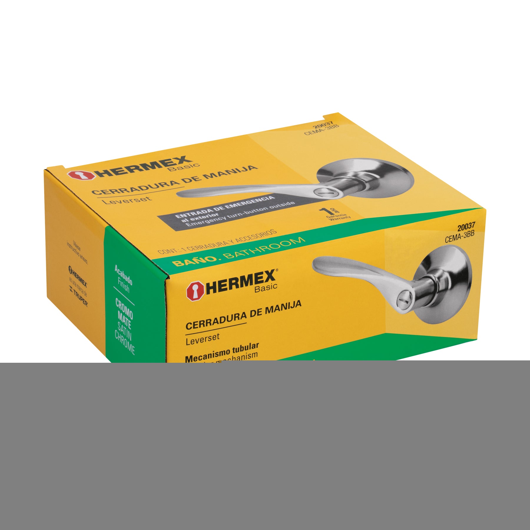 Cerradura para baño con cerrojo que incorpora botón de emergencia al exterior y botón de seguridad al interior, mecanismo tubular con cilindro metálico y compatibilidad con puertas derechas o izquierdas de 32 a 45 mm de espesor; incluye picaporte, contra, tornillos y plantilla de instalación.