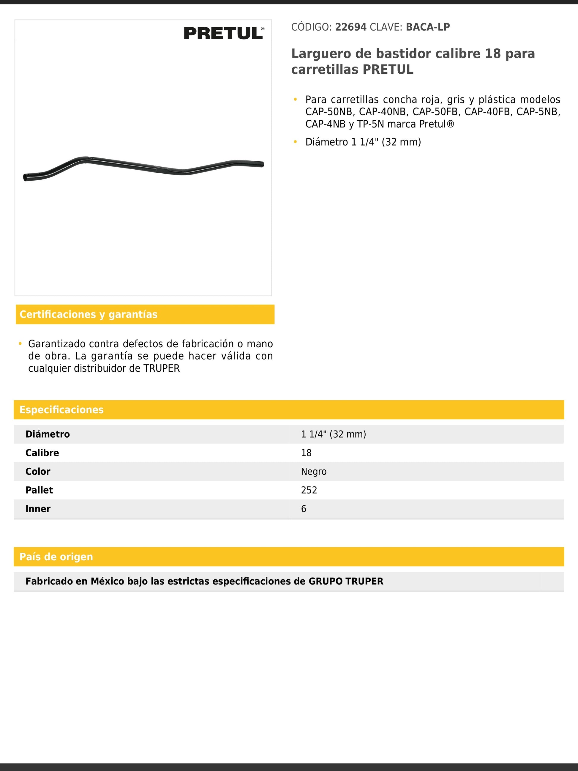 Larguero diseñado para carretillas concha roja, gris y plástica en modelos CAP-50NB, CAP-40NB, CAP-50FB, CAP-40FB, CAP-5NB, CAP-4NB y TP-5N. Fabricado en acero calibre 18 con diámetro de 1 1/4" (32 mm). Su color negro garantiza una apariencia uniforme y resistente.