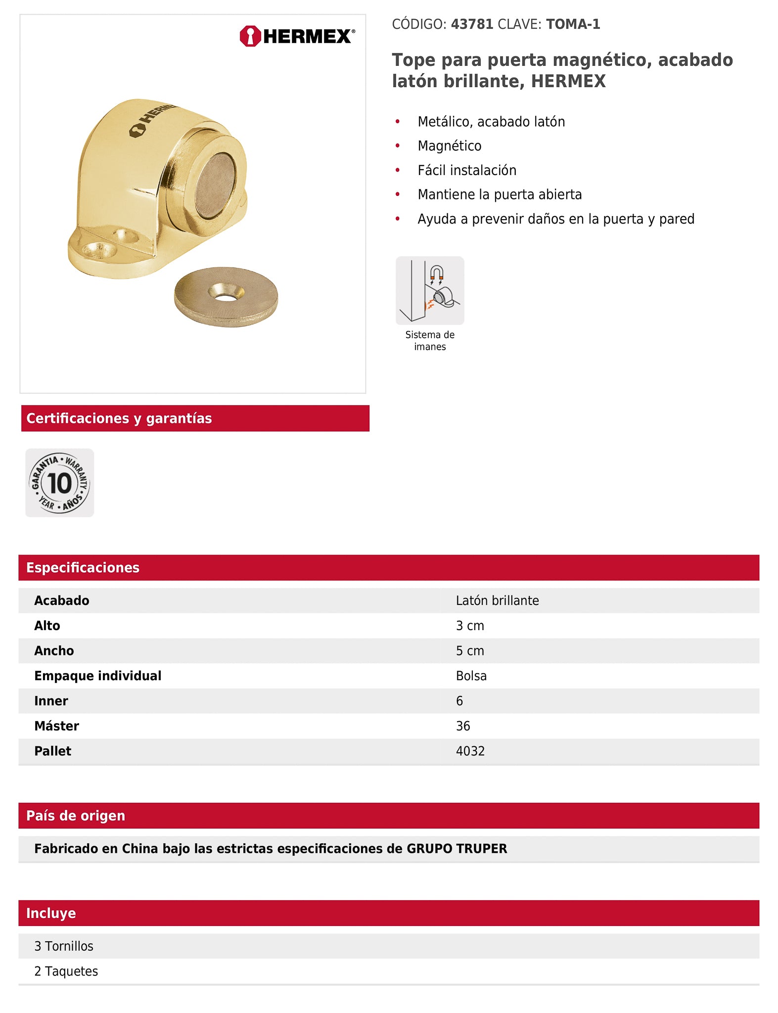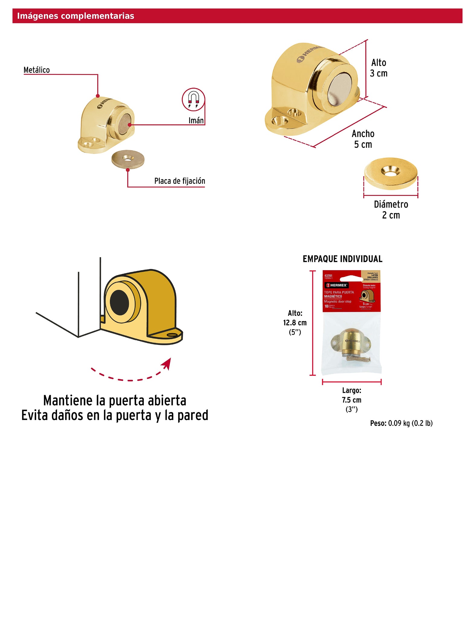Tope para puerta magnético fabricado en metal con acabado en latón brillante. Diseñado para mantener la puerta abierta y evitar daños en la pared o superficie, cuenta con sistema de imanes de alta fuerza. Su instalación es rápida y segura, ideal para interiores donde se busca combinar funcionalidad con un acabado elegante.