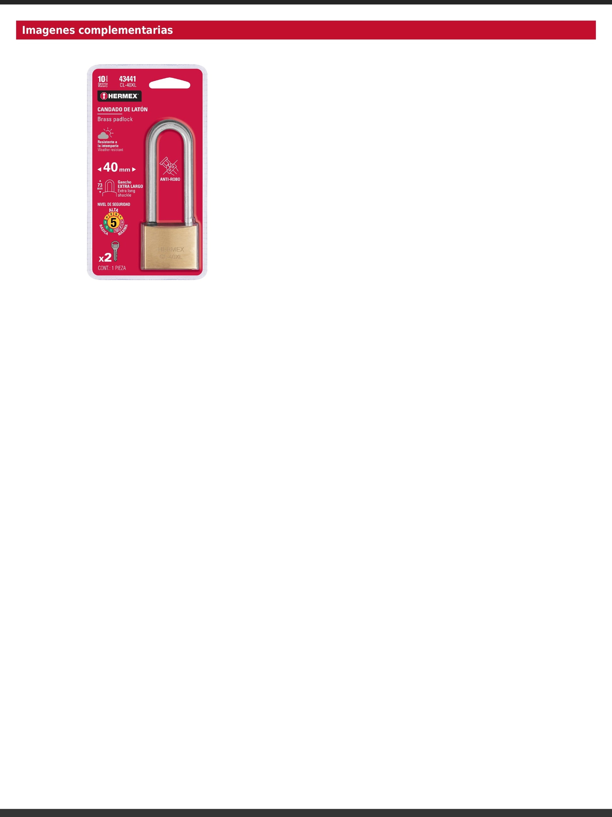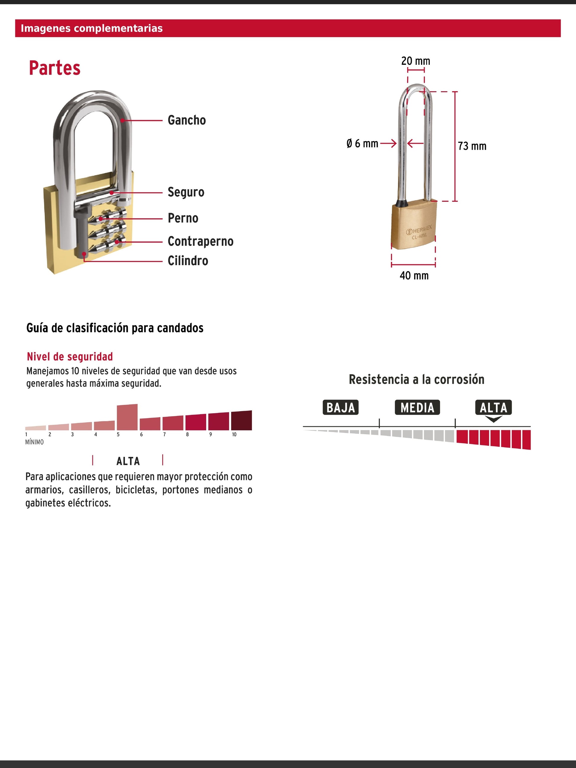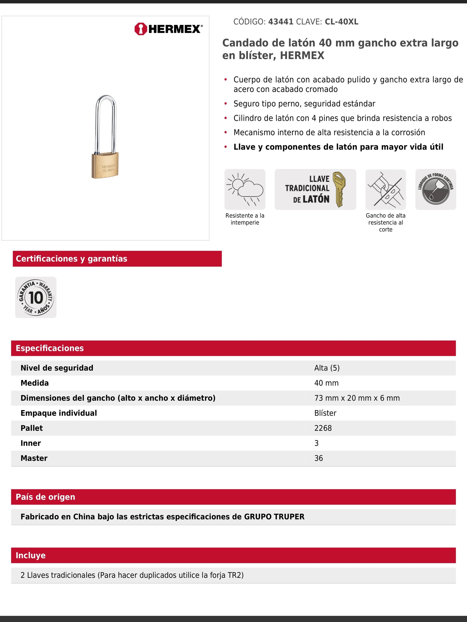 Candado de latón con acabado pulido y gancho extra largo de acero cromado. Incorpora seguro tipo perno estándar, cilindro de latón con 4 pines y mecanismo interno anticorrosión. Sus componentes de latón ofrecen mayor vida útil y resistencia a la intemperie.
