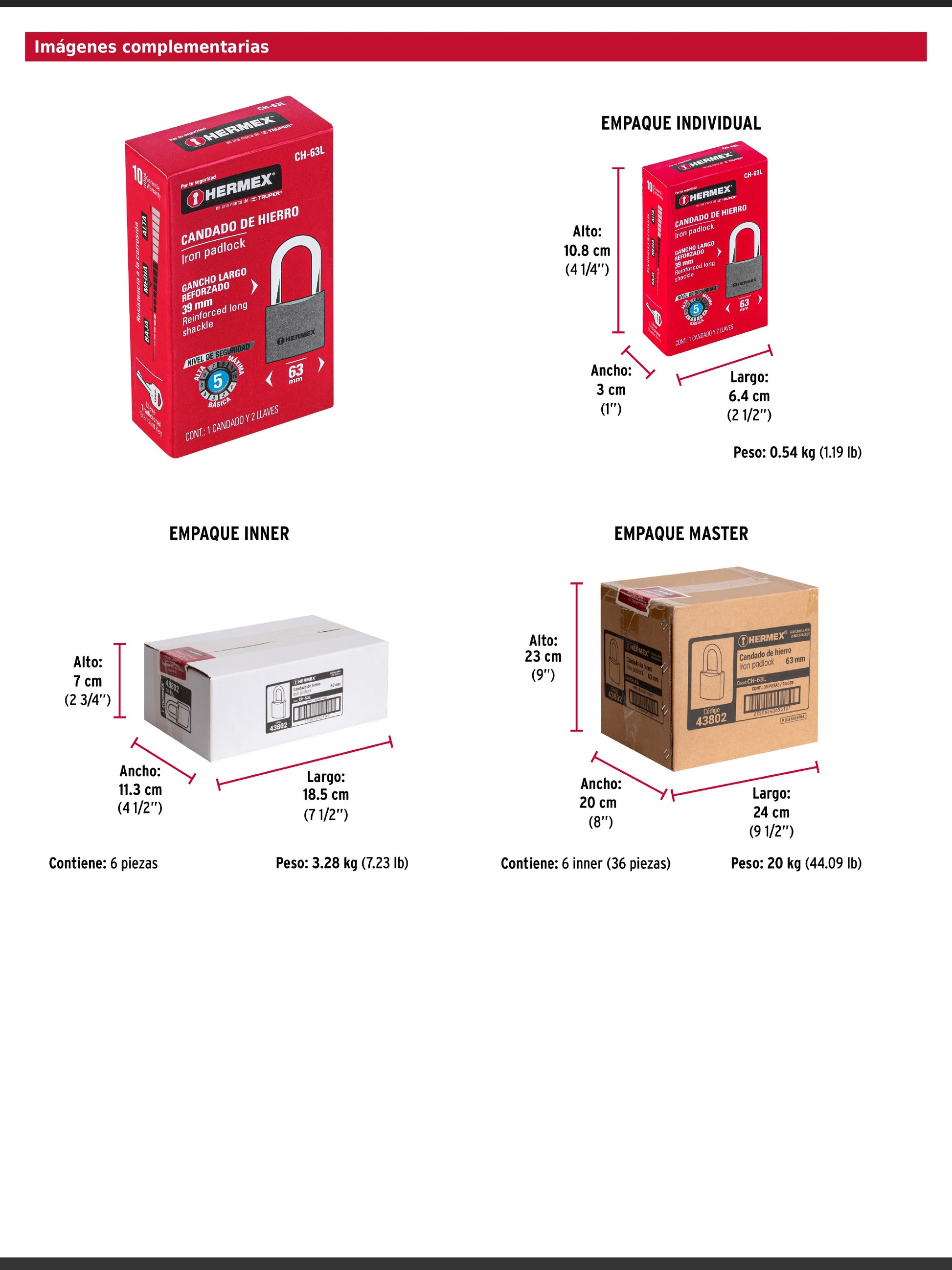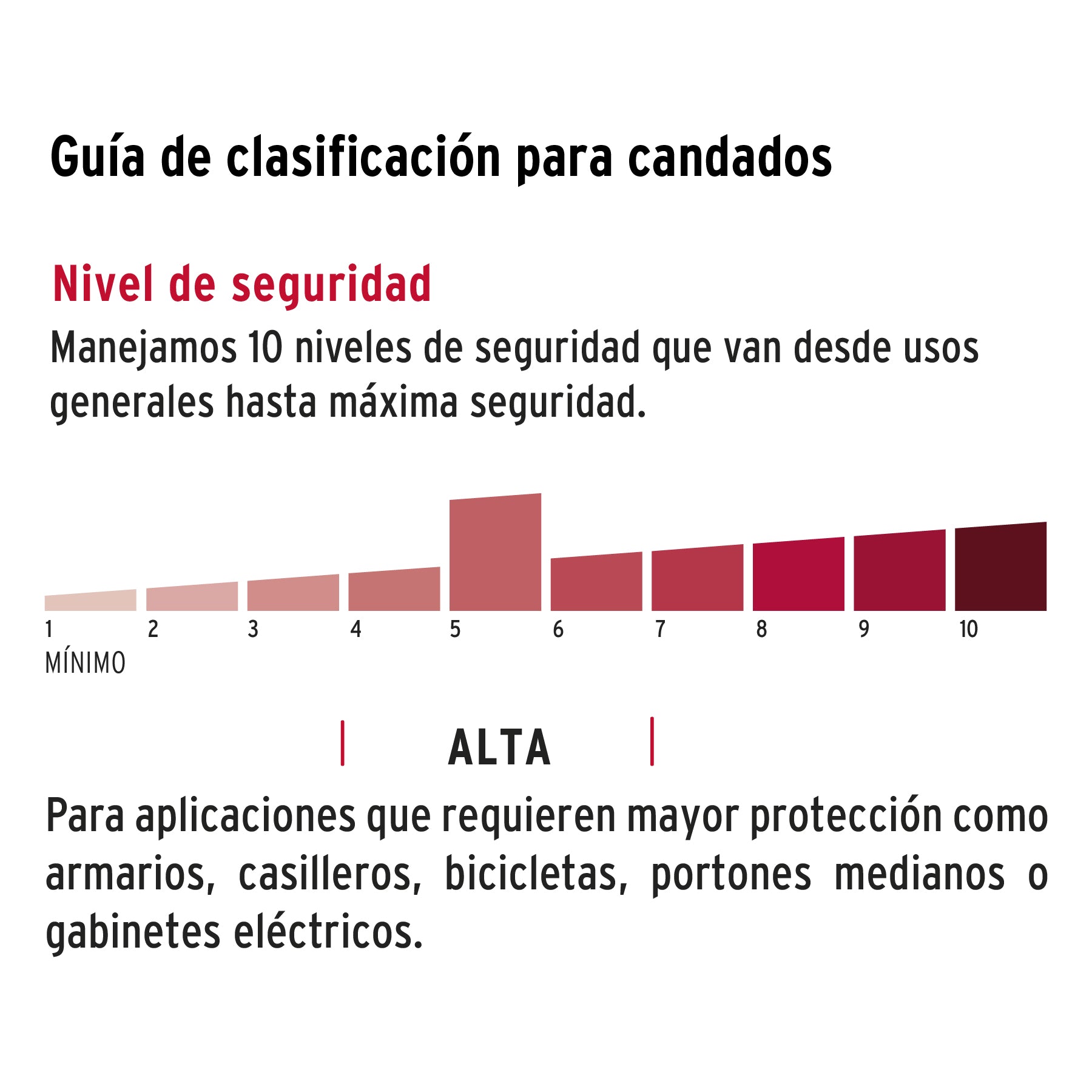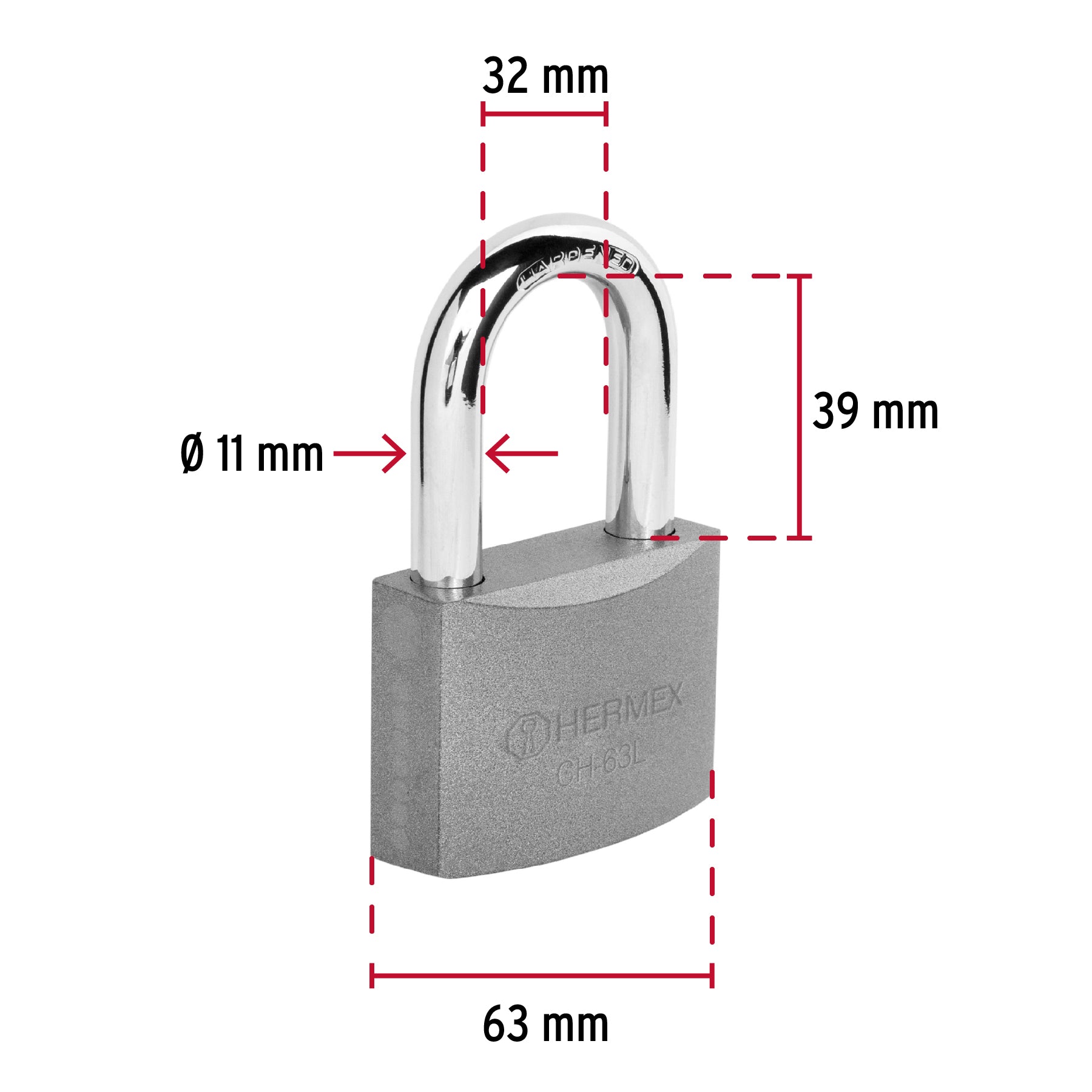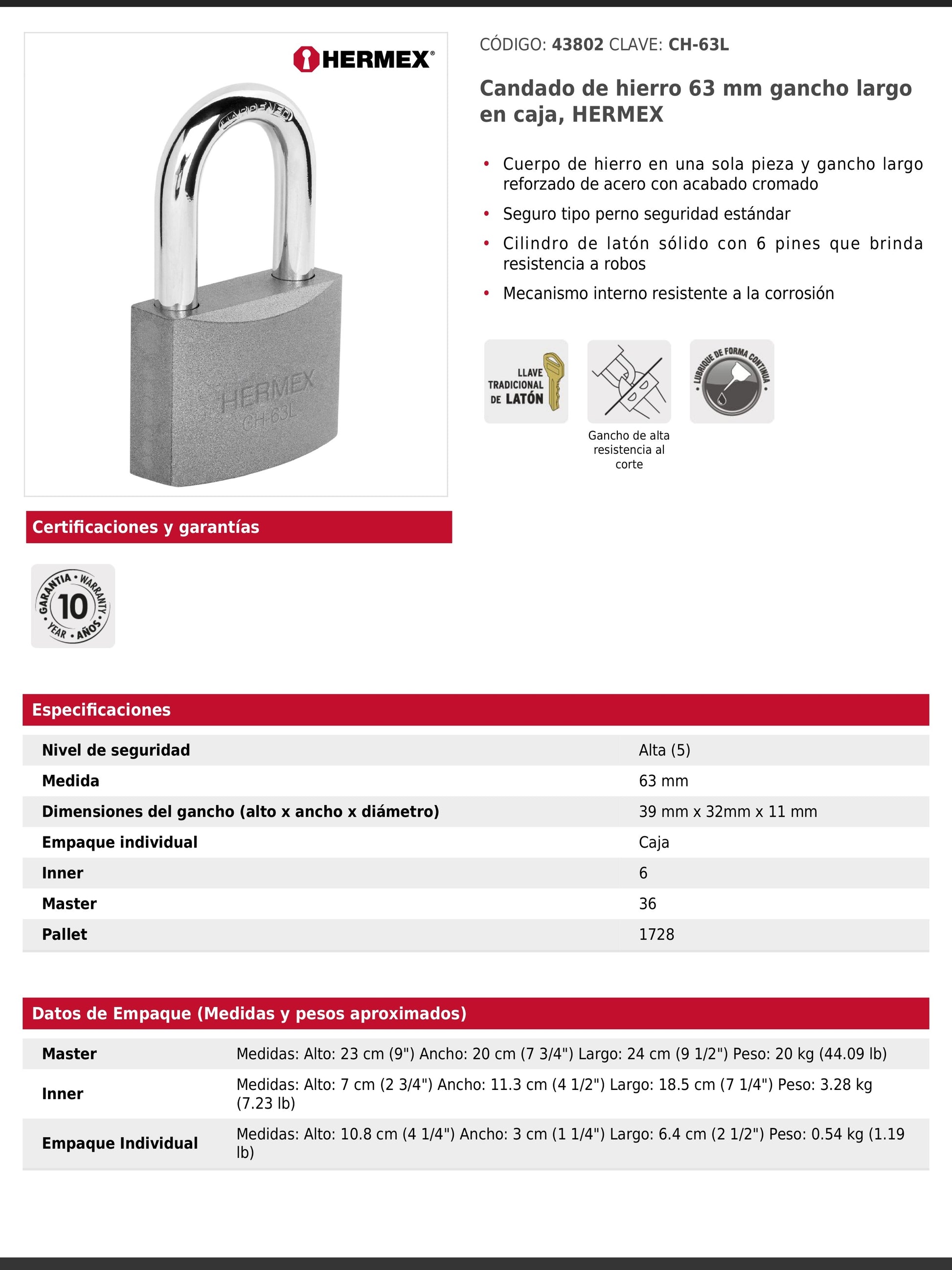 Candado de hierro en una sola pieza con acabado resistente y gancho largo reforzado de acero cromado. Incorpora un cilindro de latón sólido con 6 pines y seguro tipo perno estándar que brindan alta resistencia a robos. Su mecanismo interno es resistente a la corrosión e incluye 2 llaves tradicionales. Se presenta en empaque individual tipo caja.