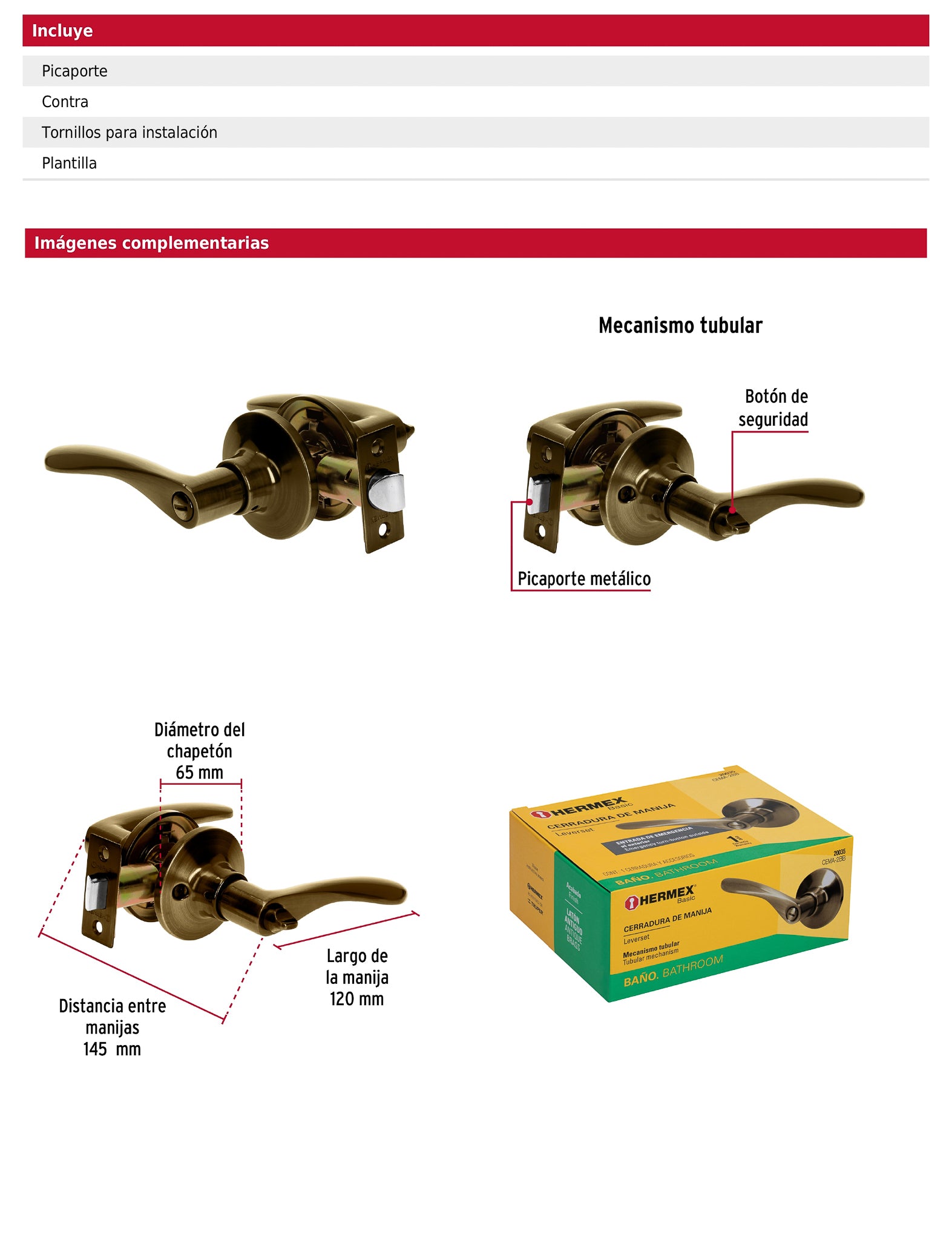 Incluye picaporte, contra, tornillos y plantilla.