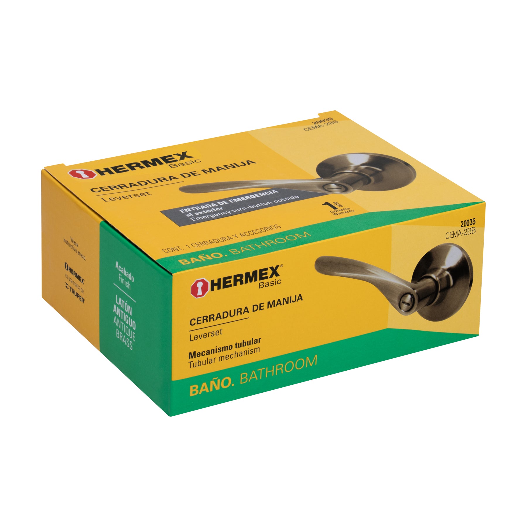 Cerradura para baño con cerrojo que ofrece botón de emergencia al exterior y botón de seguridad al interior, mecanismo tubular con cilindro metálico y compatibilidad con puertas derechas o izquierdas de 32 a 45 mm de espesor; incluye picaporte, contra, tornillos y plantilla de instalación.