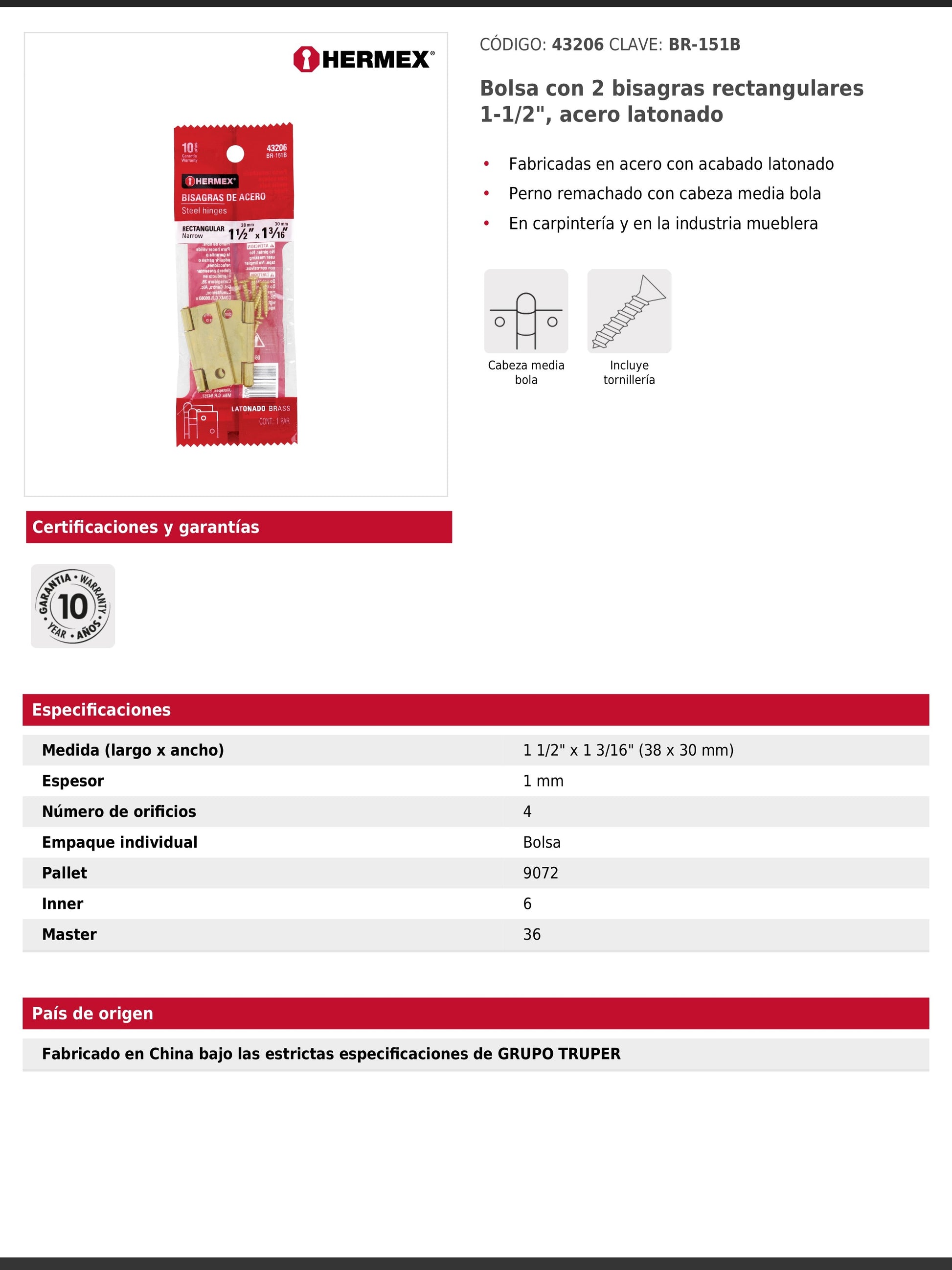 Bisagras fabricadas en acero con acabado latonado, con perno remachado y cabeza media bola. Pensadas para carpintería y la industria mueblera, se presentan en bolsa con 2 piezas e incluyen tornillería para su instalación.